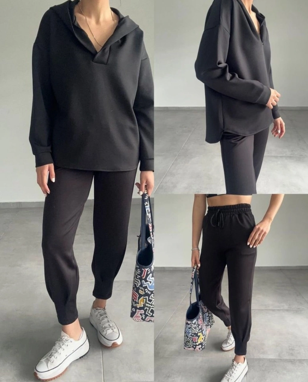 Kadın Uzun Kol V Yaka Kapüşon Detay Sweat Ve Yüksel Bel Eşofman Ikili Takım