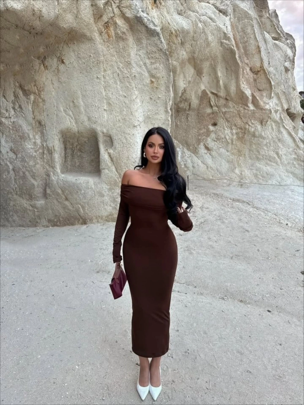 Kadın Uzun Kollu Madonna Yaka Midi Boy Elbise