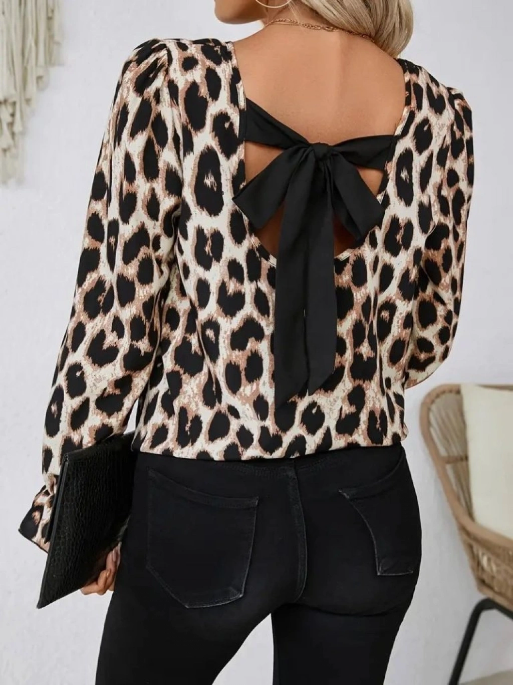 Kadın Uzun Kollu Arkadan Fiyonk Detaylı Leopar Desenli Süprem Bluz