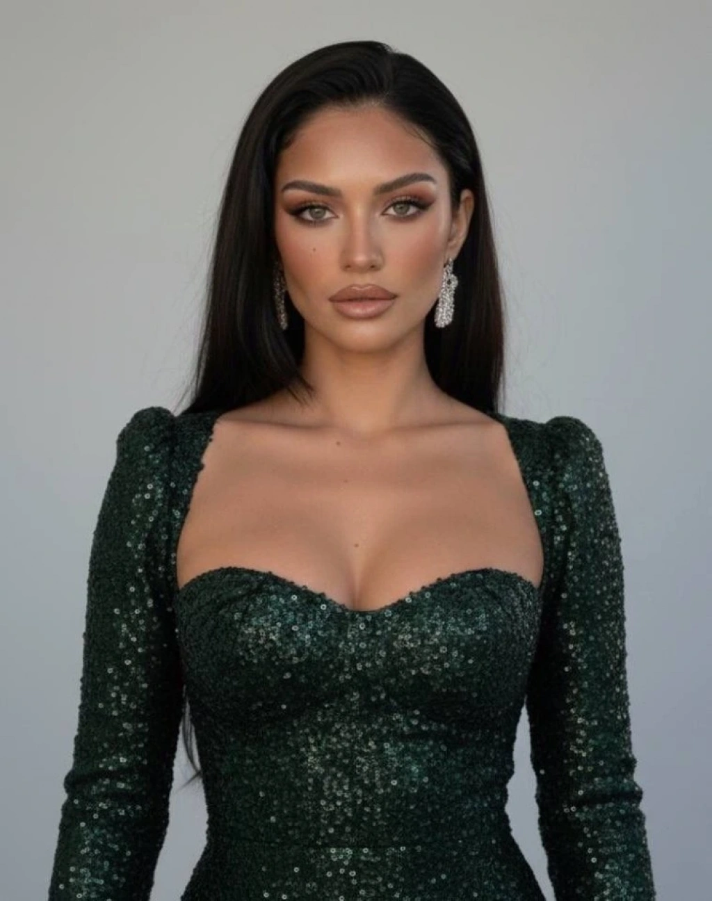 Kadın Uzun Kollu Armut Yaka Pul Payet Işlemeli ini Gece Elbisesi
