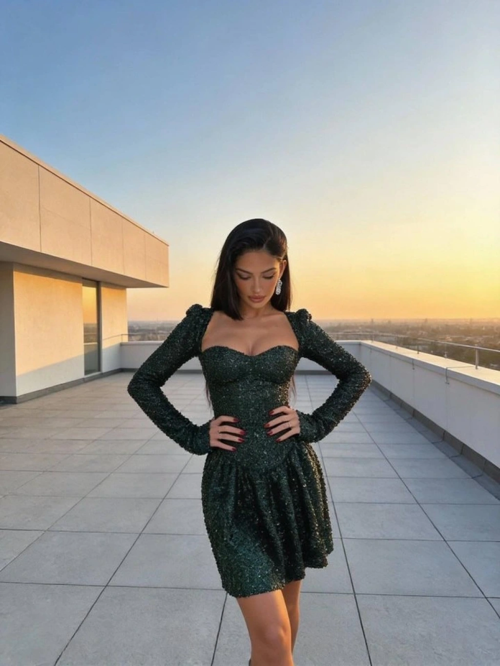 Kadın Uzun Kollu Armut Yaka Pul Payet Işlemeli Mini Gece Elbisesi