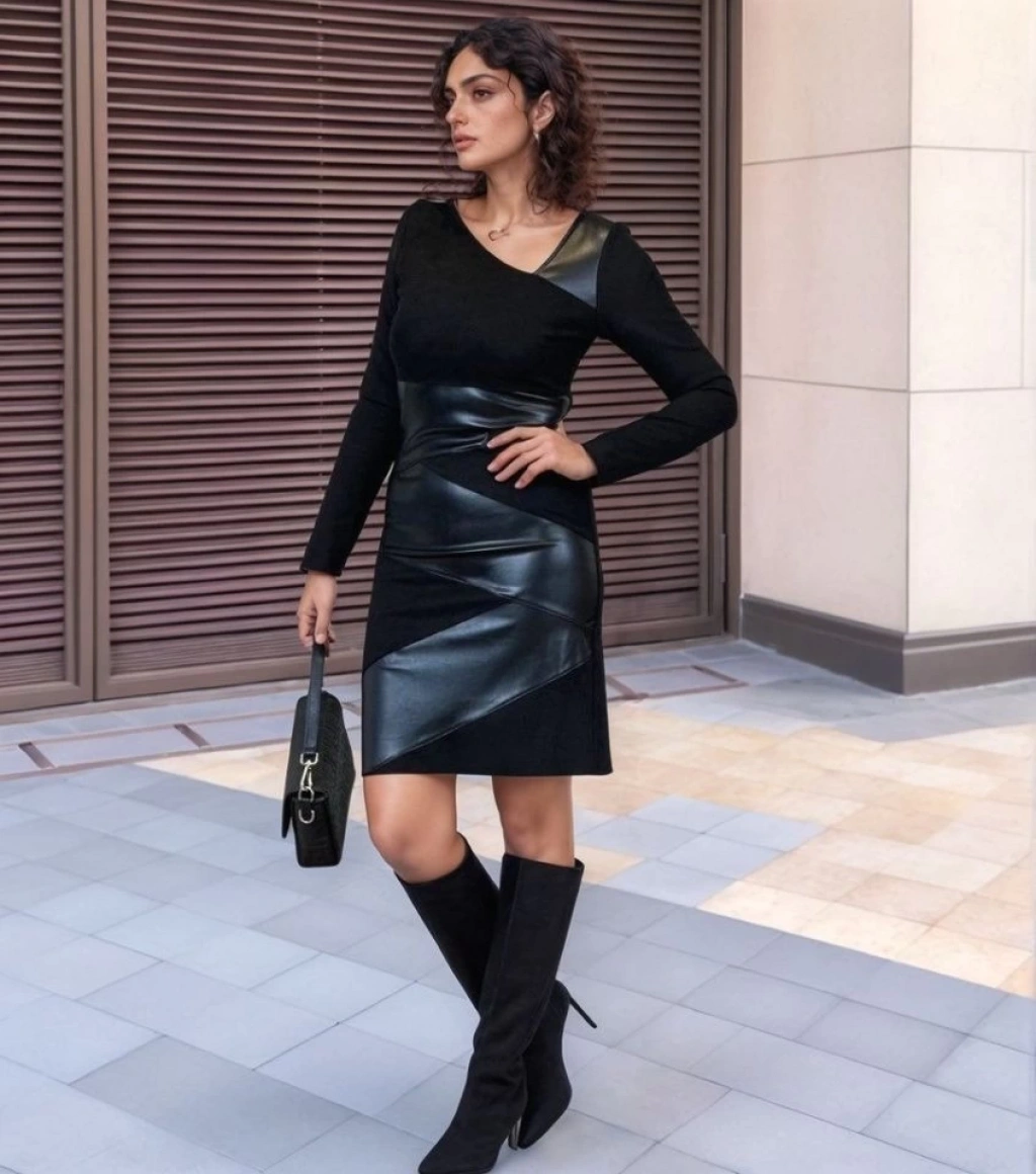 Kadın Uzun Kollu Asimetrik Yaka Süet Ve Deri Mini Boy Elbise