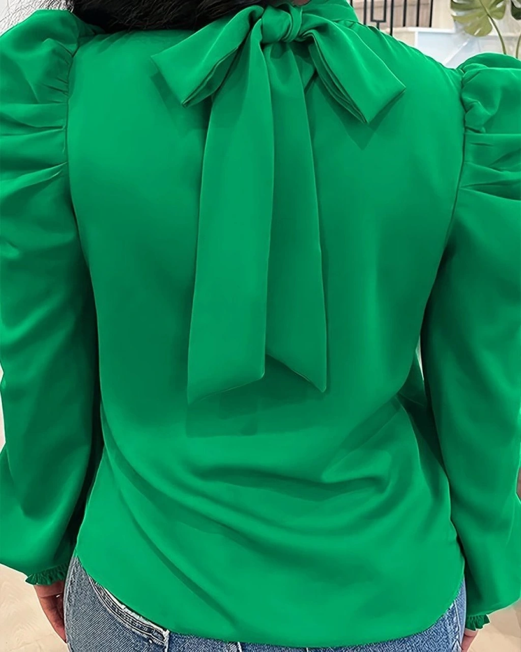 Kadın Uzun Kollu Balıkçı Yaka Arkadan Bağlamalı Omuzlardan Balon Ithal Krep Bluz