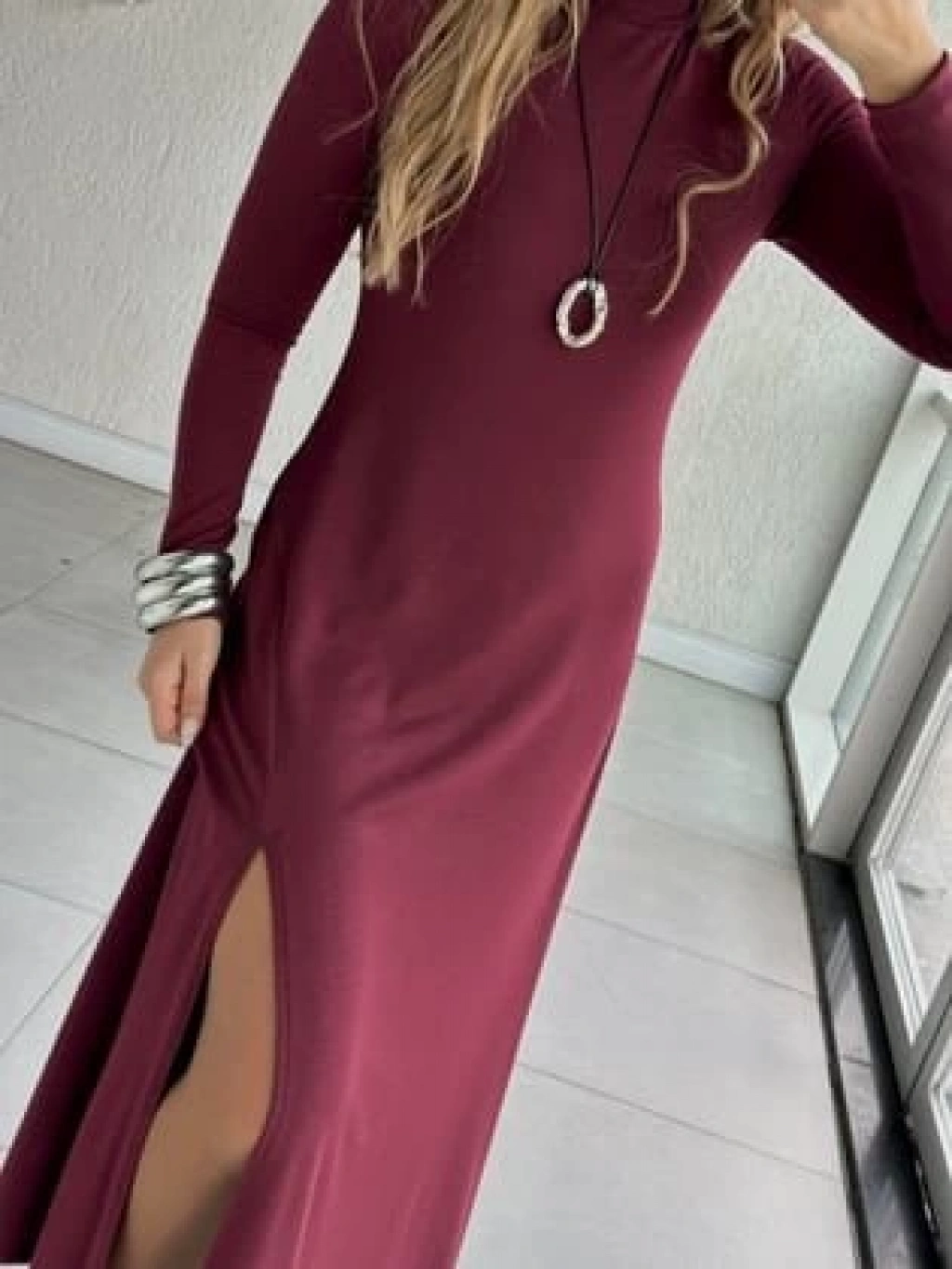 Kadın Uzun Kollu Balıkçı Yaka Derin Yırtmaç Detay Krep Elbise