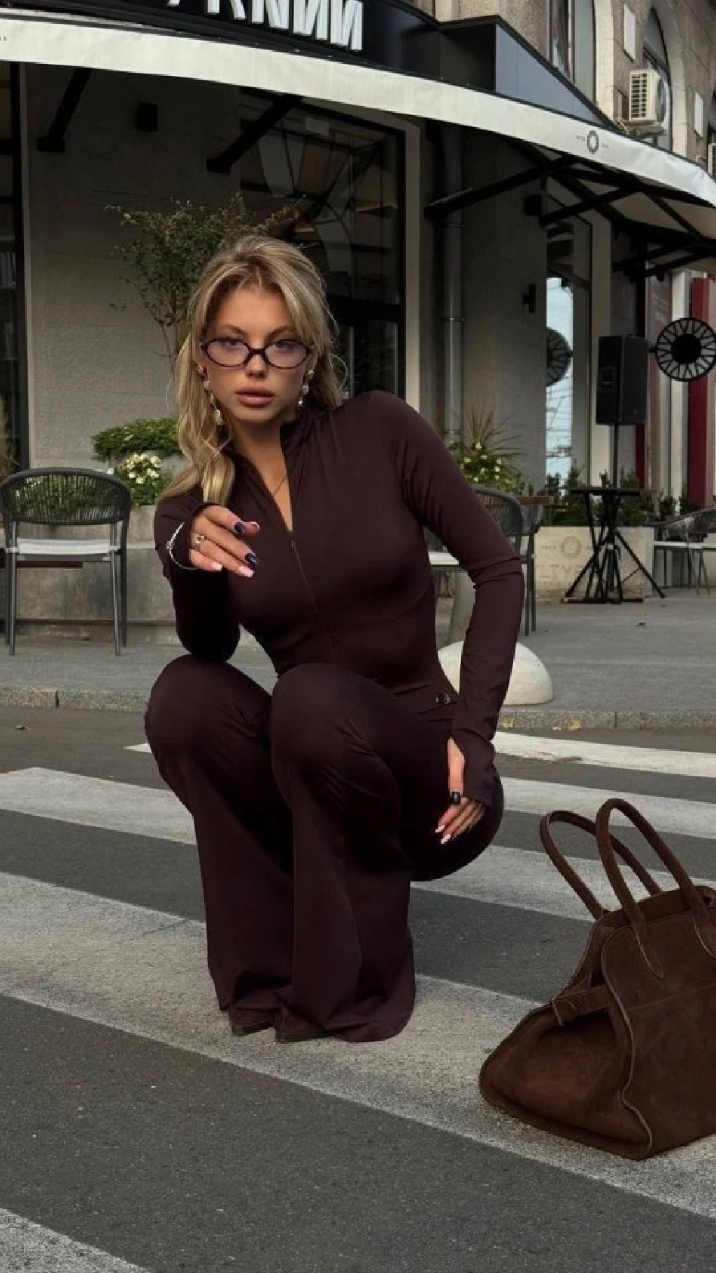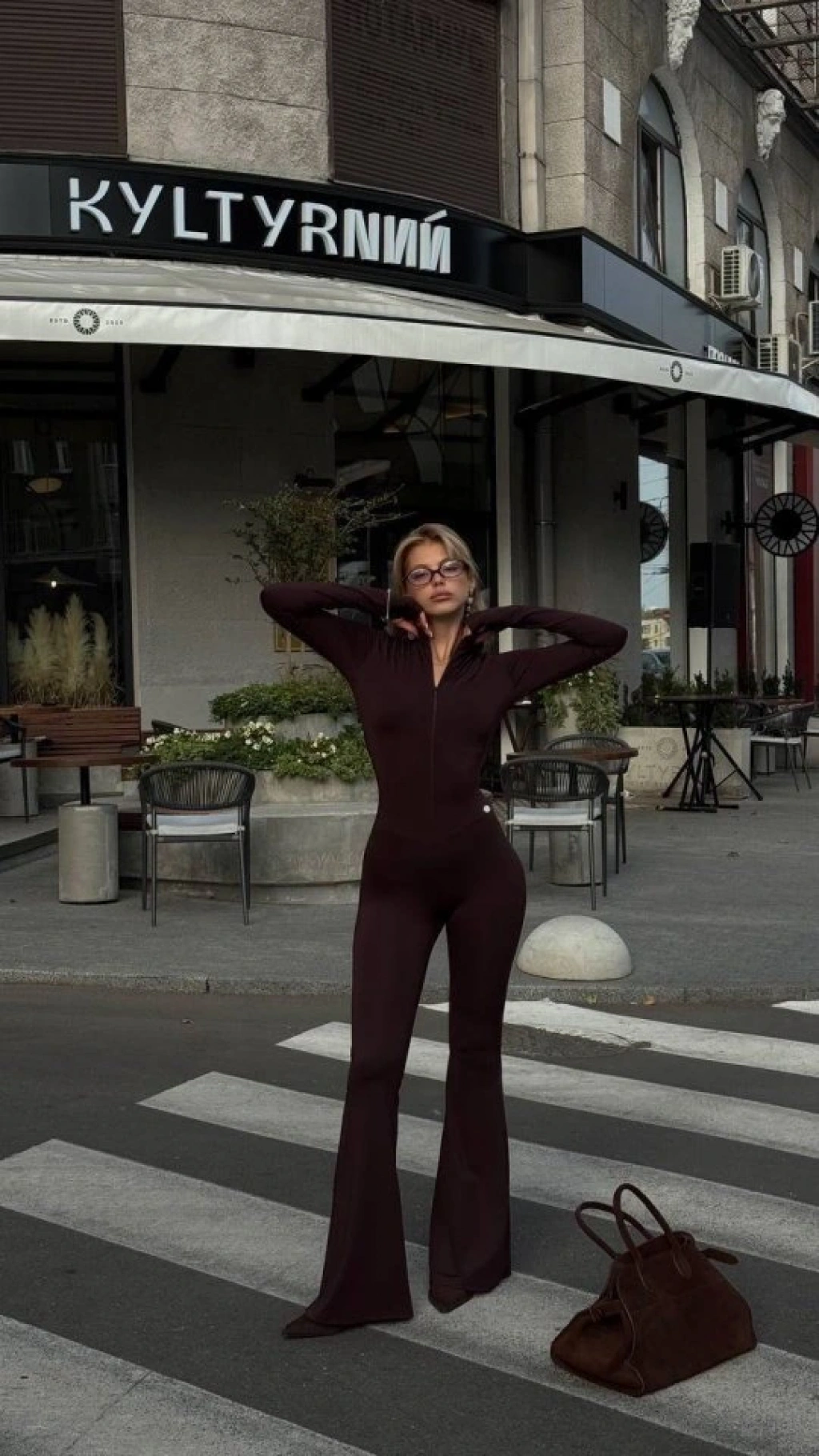 Kadın Uzun Kollu Balıkçı Yaka Fermuar Detay Ispanyol Paça Tulum
