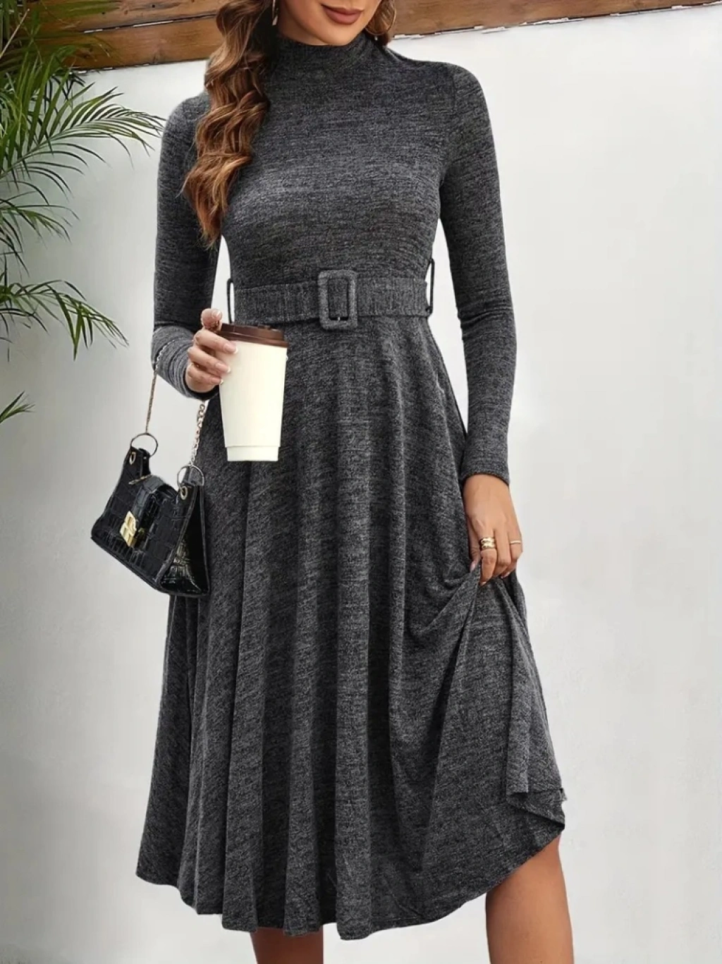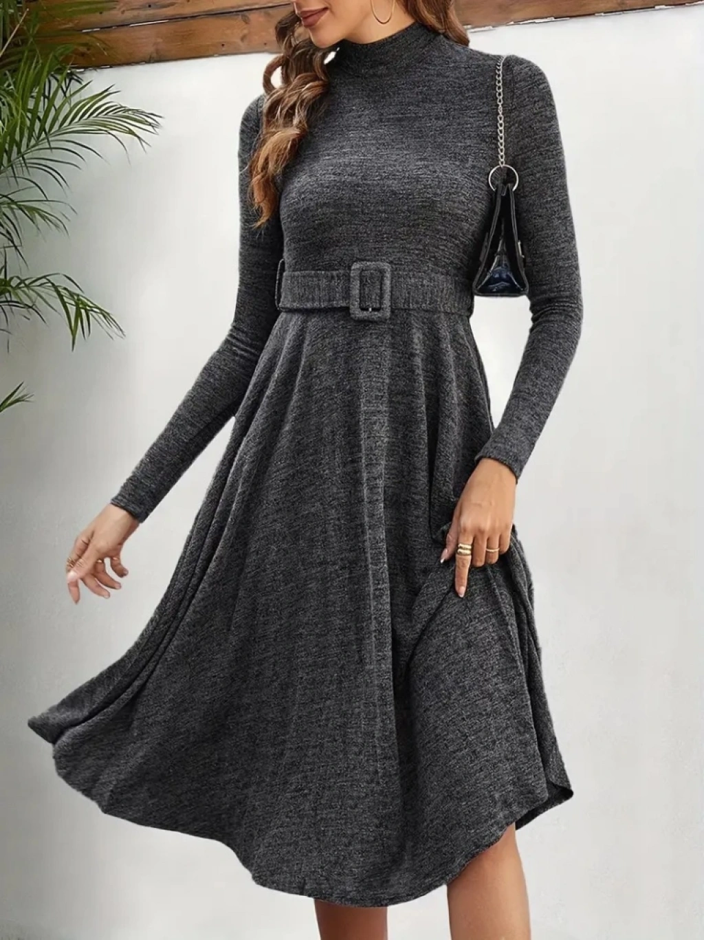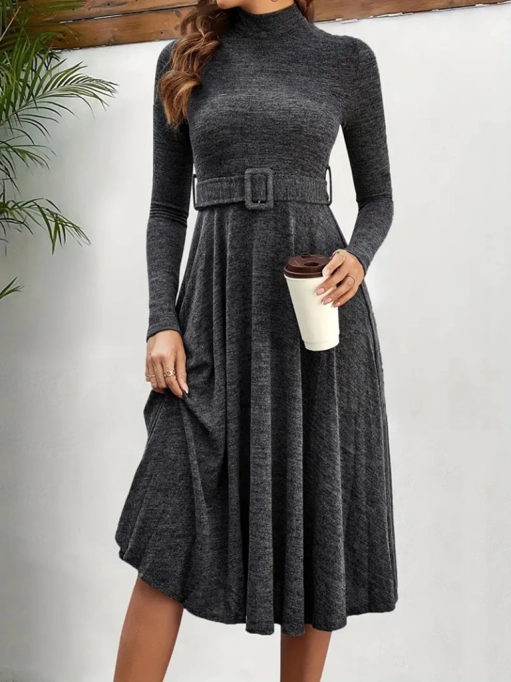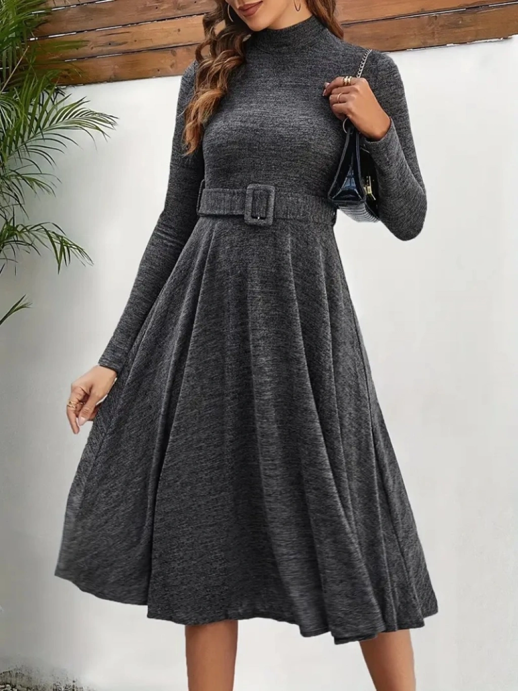 Kadın Uzun Kollu Balıkçı Yaka Kemer Detaylı Yumoş Midi Elbise