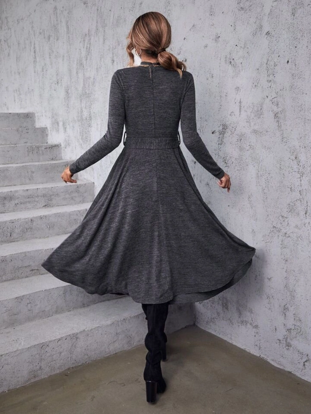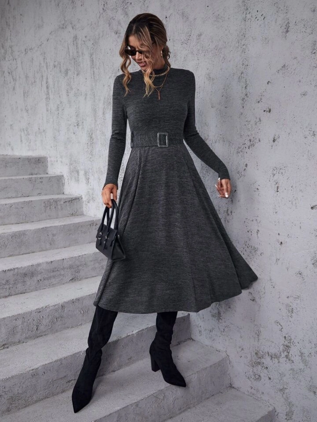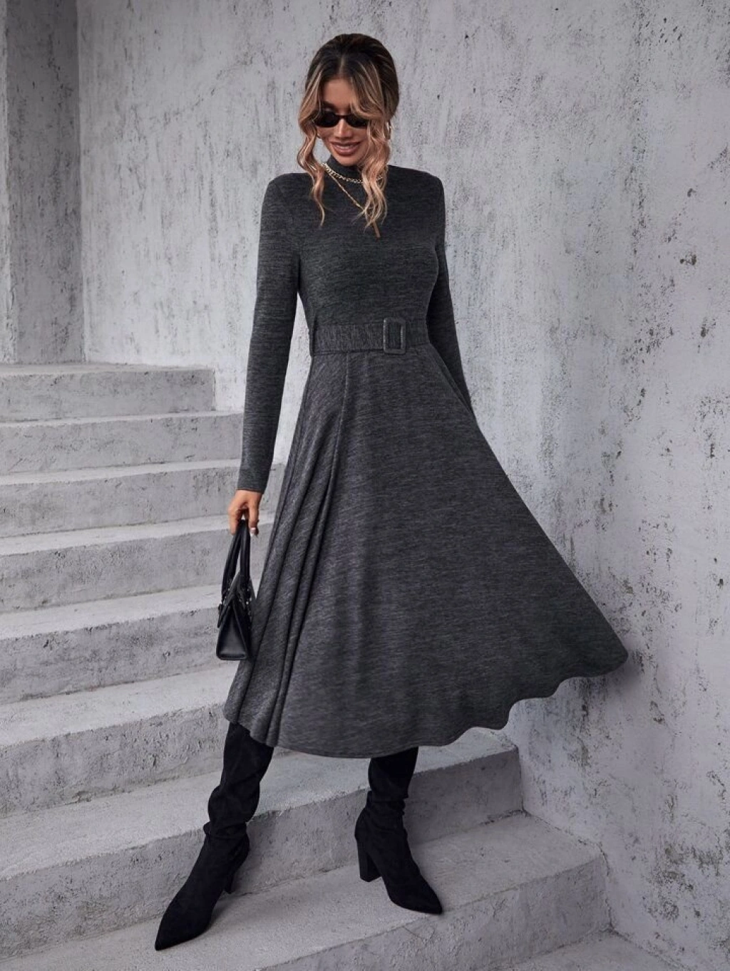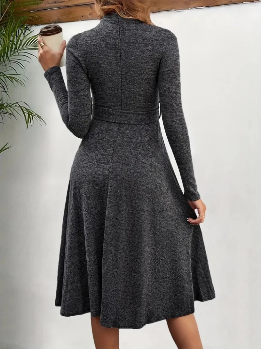 Kadın Uzun Kollu Balıkçı Yaka Kemer Detaylı Yumoş Midi Elbise