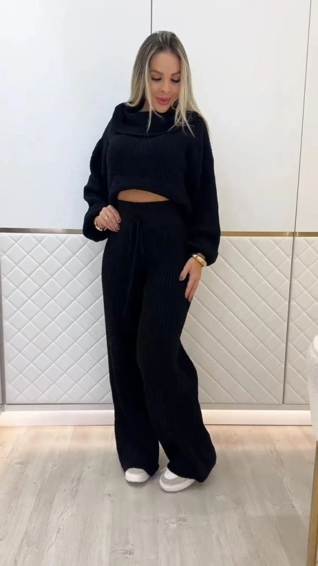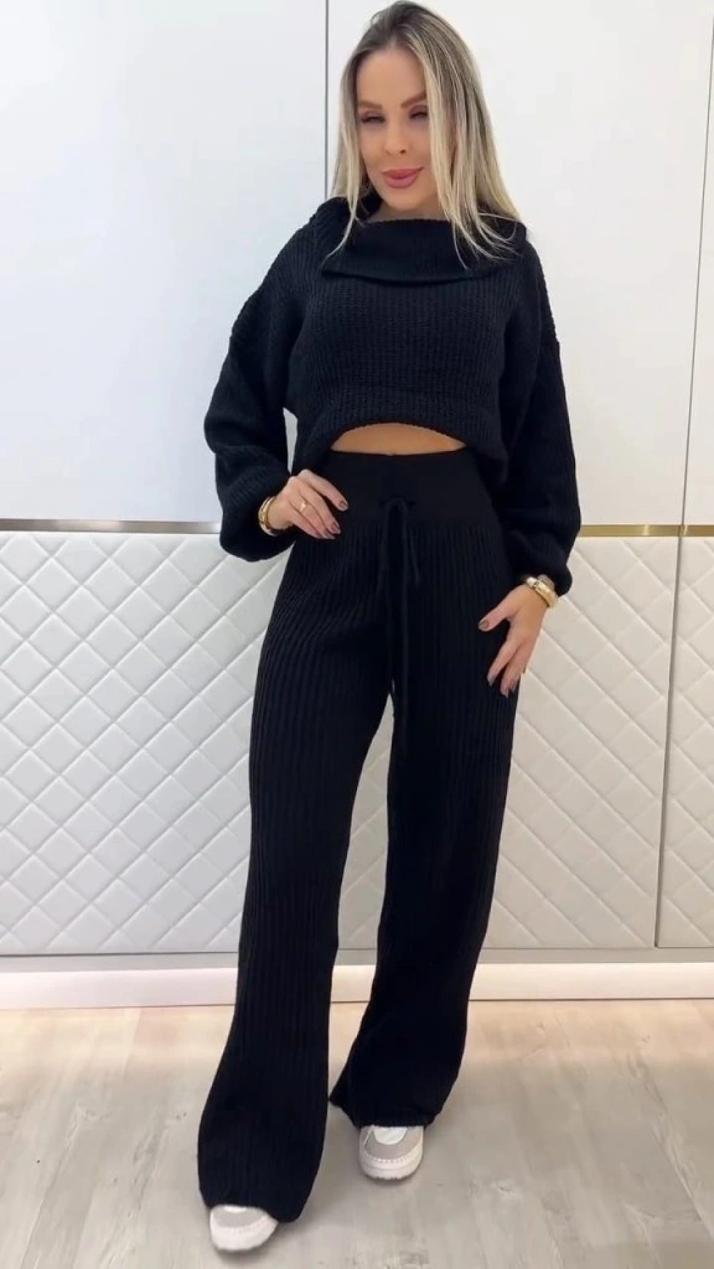 Kadın Uzun Kollu Balıkçı Yaka Kısa Triko Bluz Ve Pantolon Ikili Takım