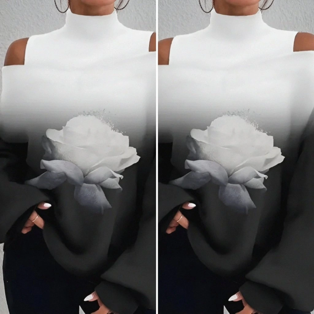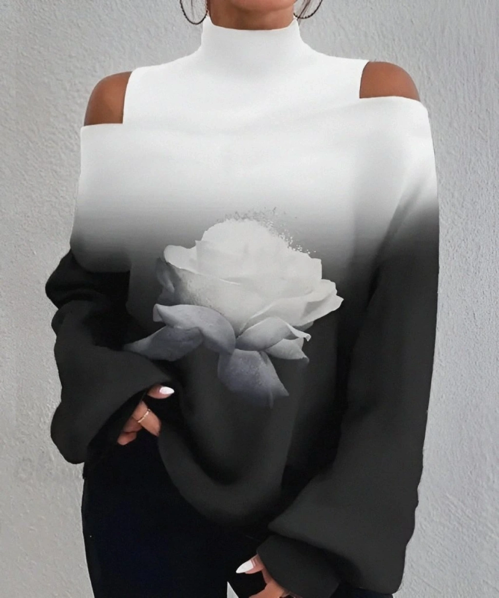 Kadın Uzun Kollu Balıkçı Yaka Omuz Pencereli Gül Dijital Baskılı şardonlu Dalgıç Salaş Bluz