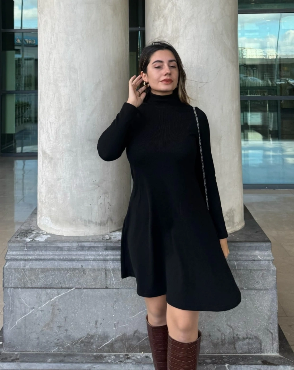 Kadın Uzun Kollu Balıkçı Yaka Salaş Kusa Akrilik Elbise