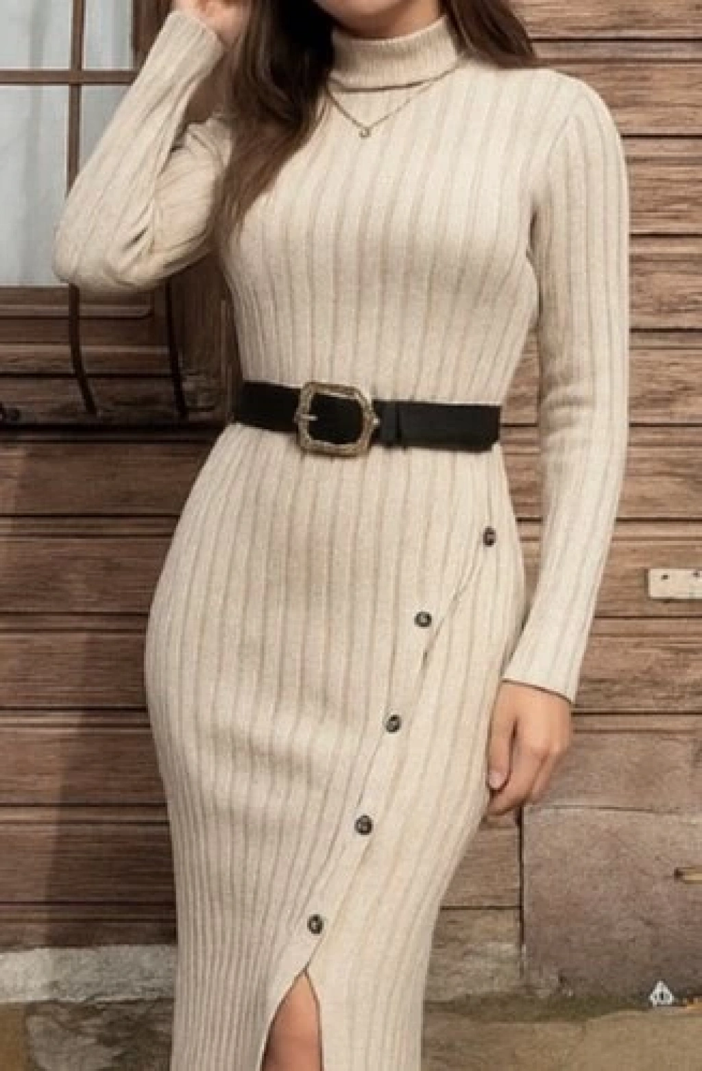 Kadın Uzun Kollu Balıkçı Yaka Yırtmaçlı Düğmeli şardonlu Kaşkorse Elbise