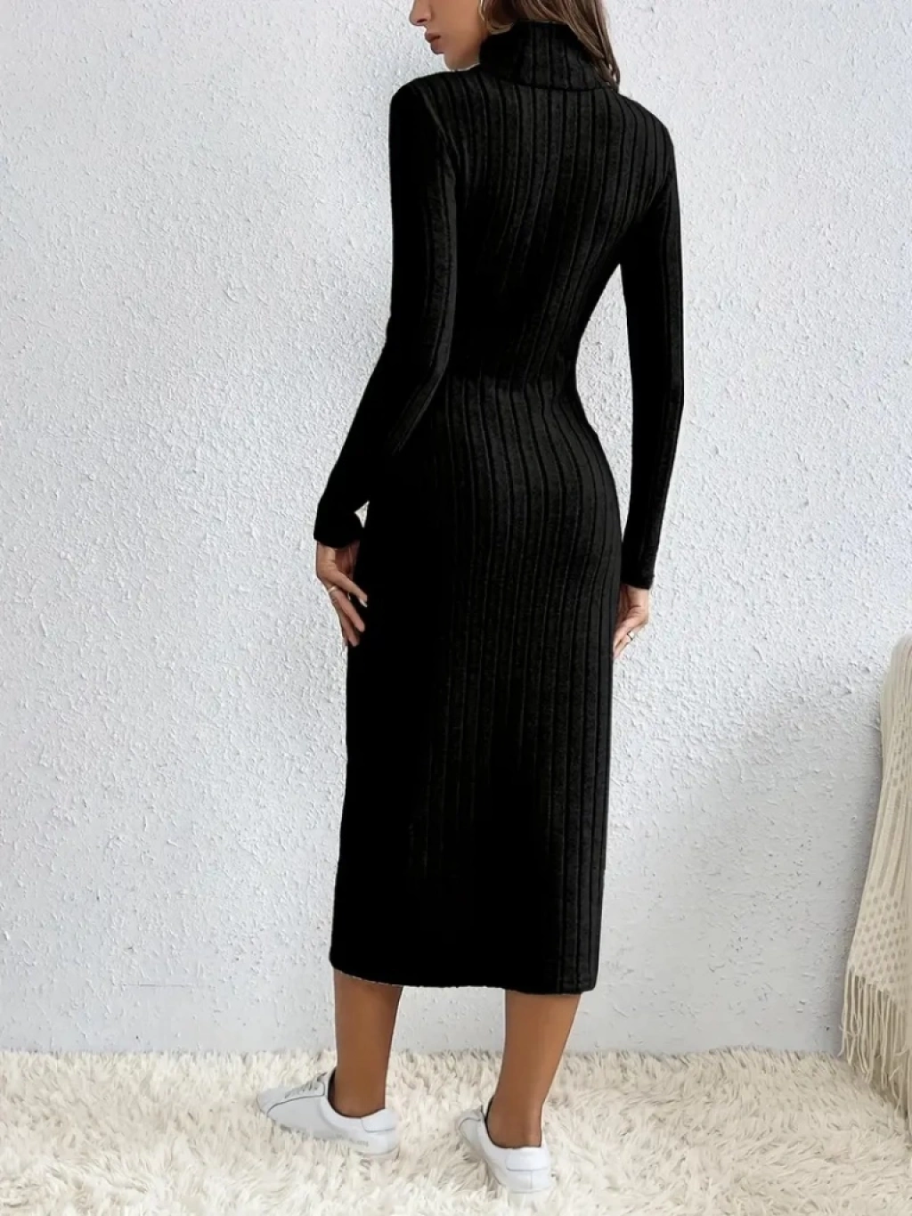 Kadın Uzun Kollu Balıkçı Yaka Yırtmaçlı Düğmeli şardonlu Kaşkorse Elbise