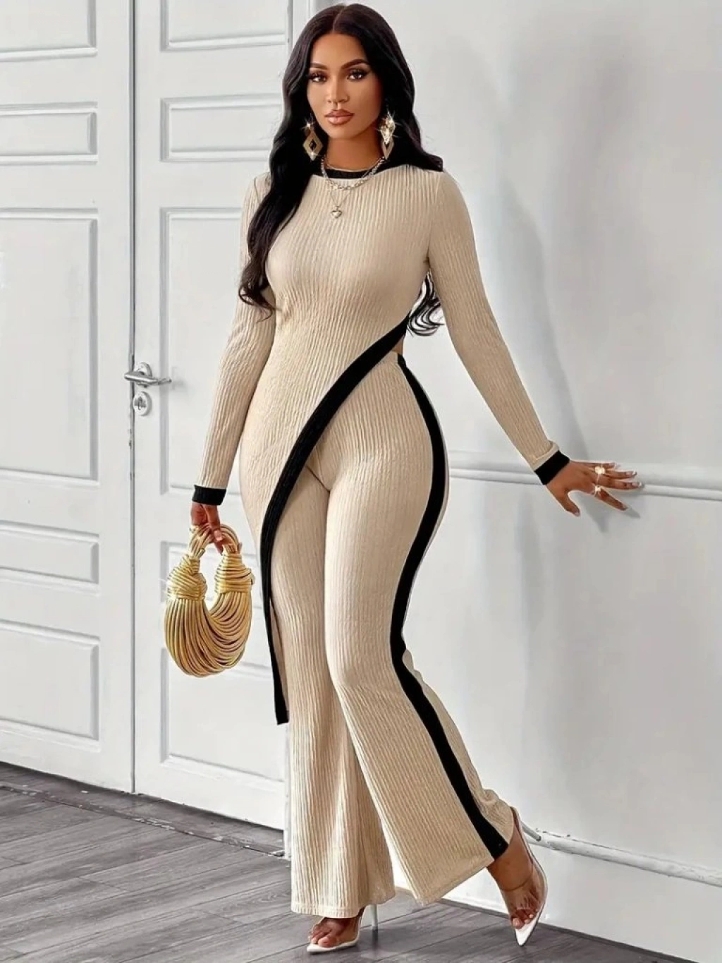 Kadın Uzun Kollu Bisiklet Yaka Asimetrik Kesim Bluz şardonlu Kaşkorse Bluz Ve Pantolon Ikili Takım