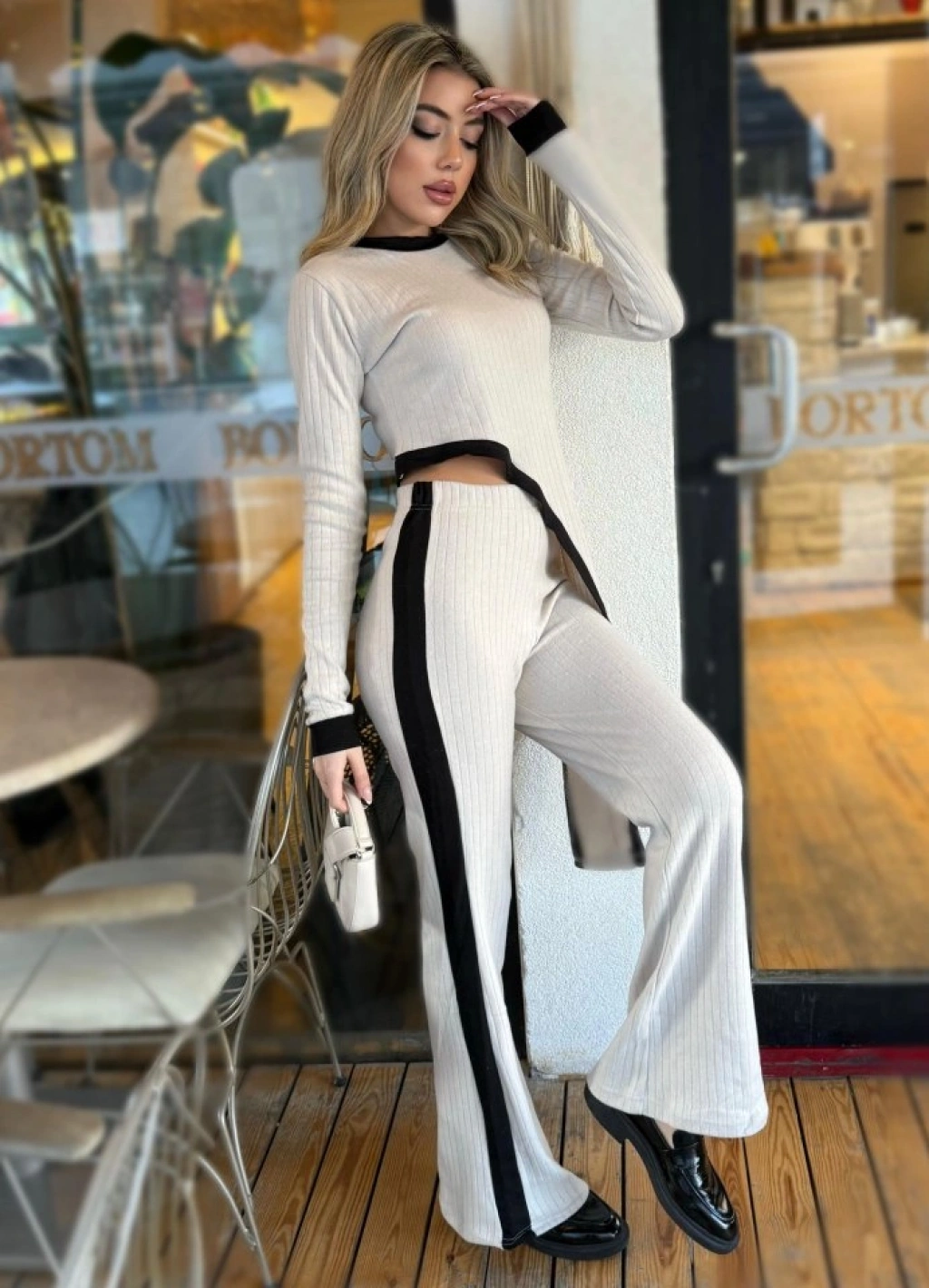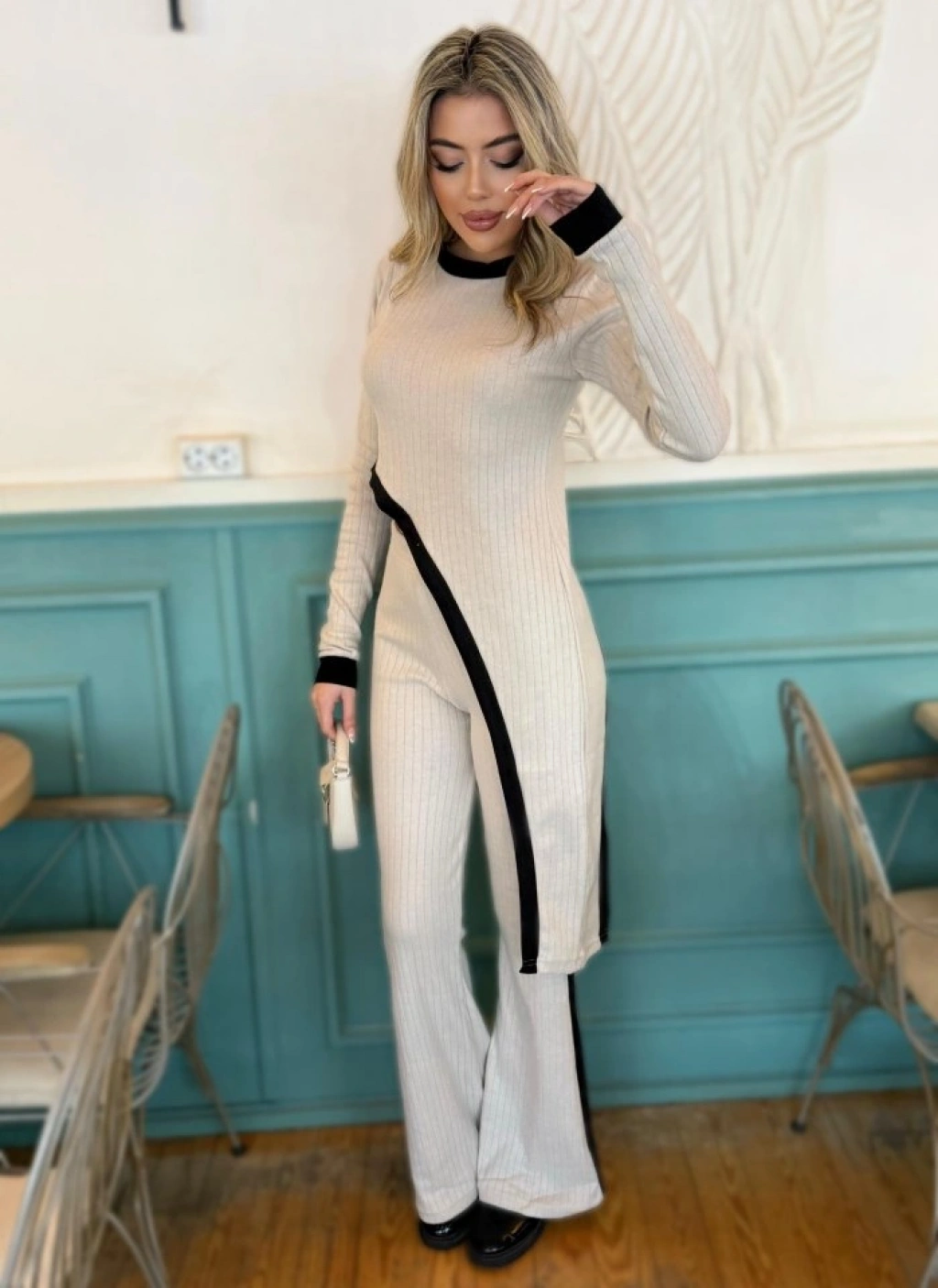 Kadın Uzun Kollu Bisiklet Yaka Asimetrik Kesim Bluz şardonlu Kaşkorse Bluz Ve Pantolon Ikili Takım