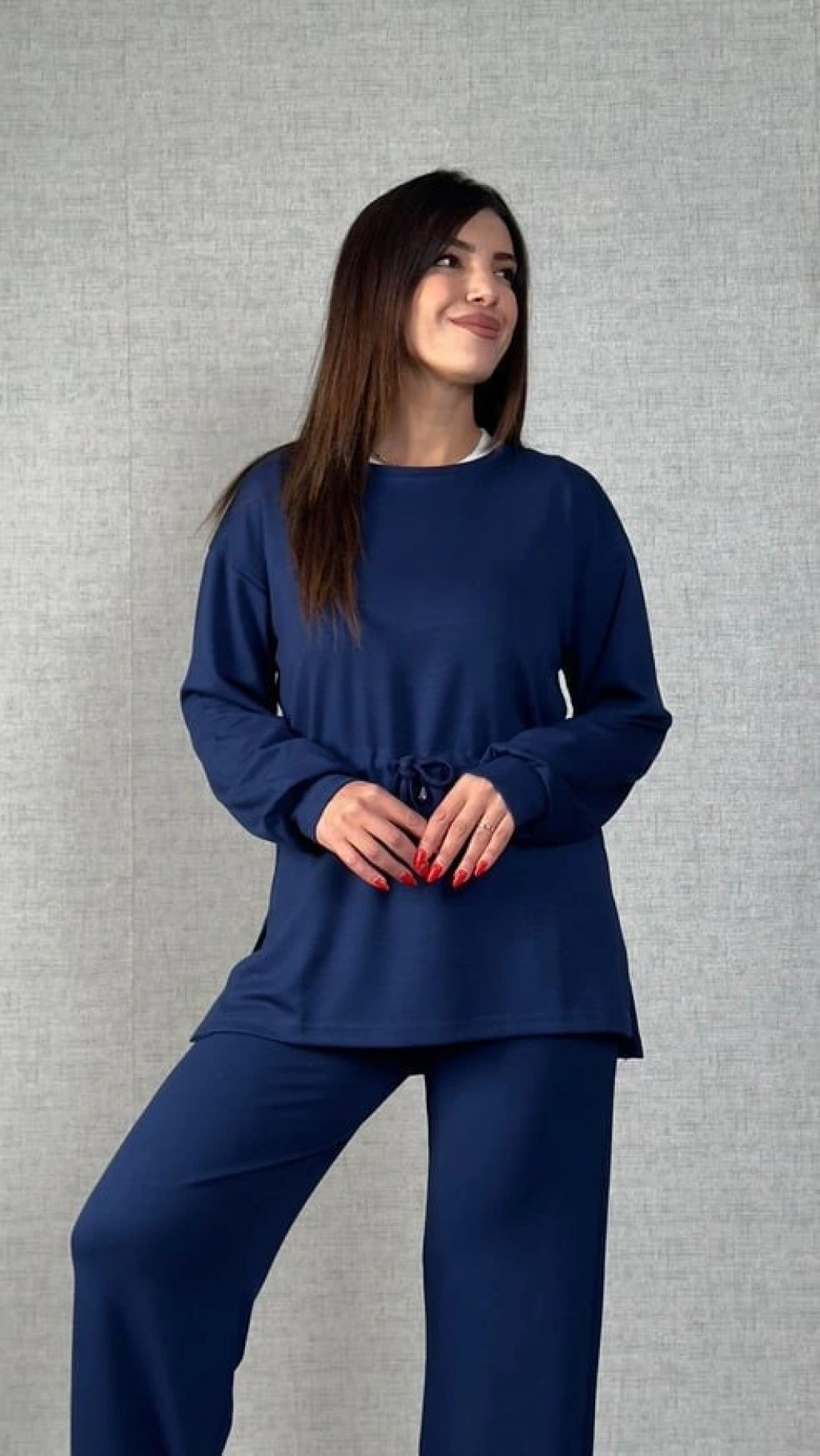 Kadın Uzun Kollu Bisiklet Yaka Belden Büzgülü Bağcıklı Viskon Iki Iplik Bluz Ve Pantolon Ikili Takım