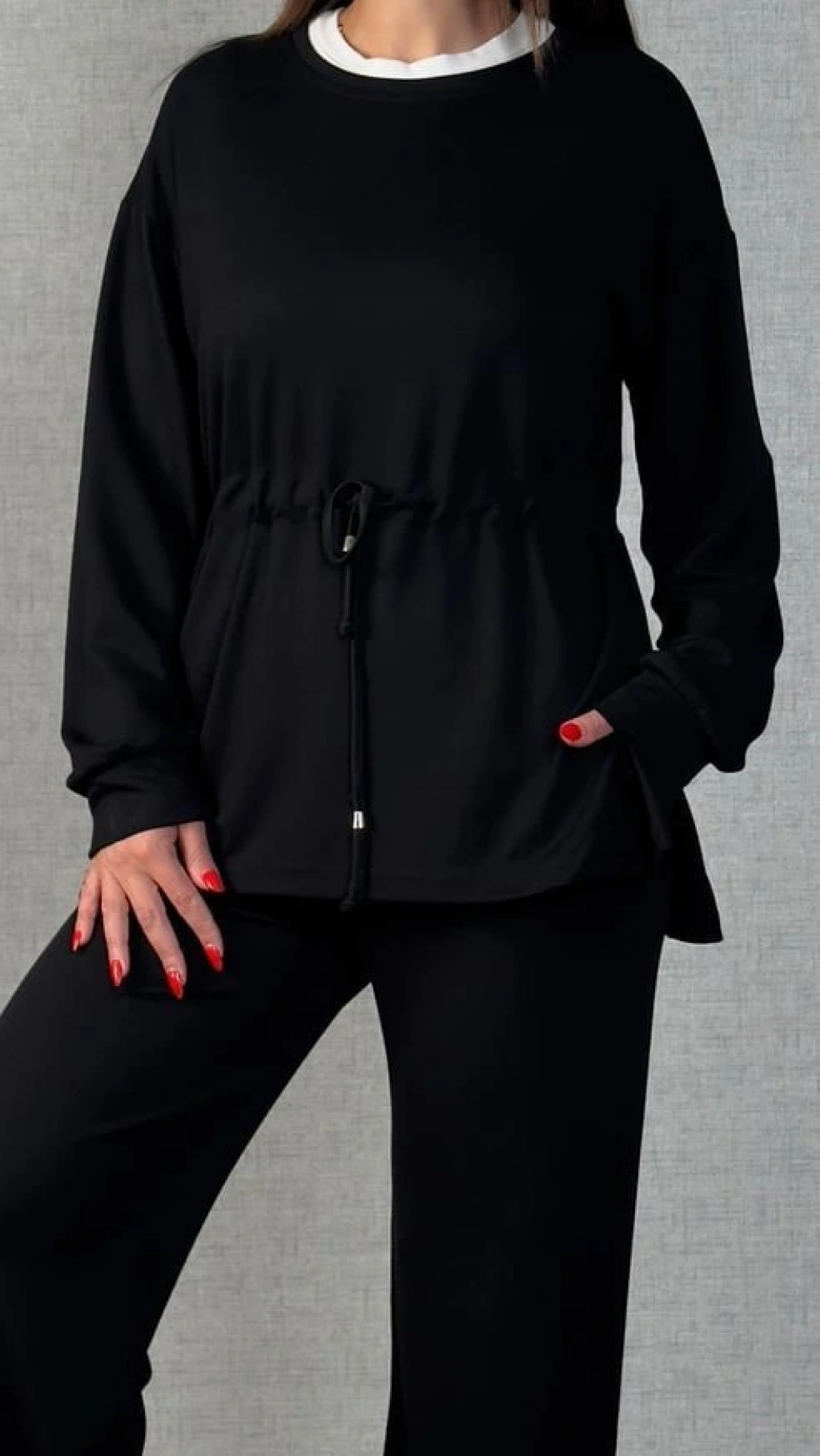 Kadın Uzun Kollu Bisiklet Yaka Belden Büzgülü Bağcıklı Viskon Iki Iplik Bluz Ve Pantolon Ikili Takım