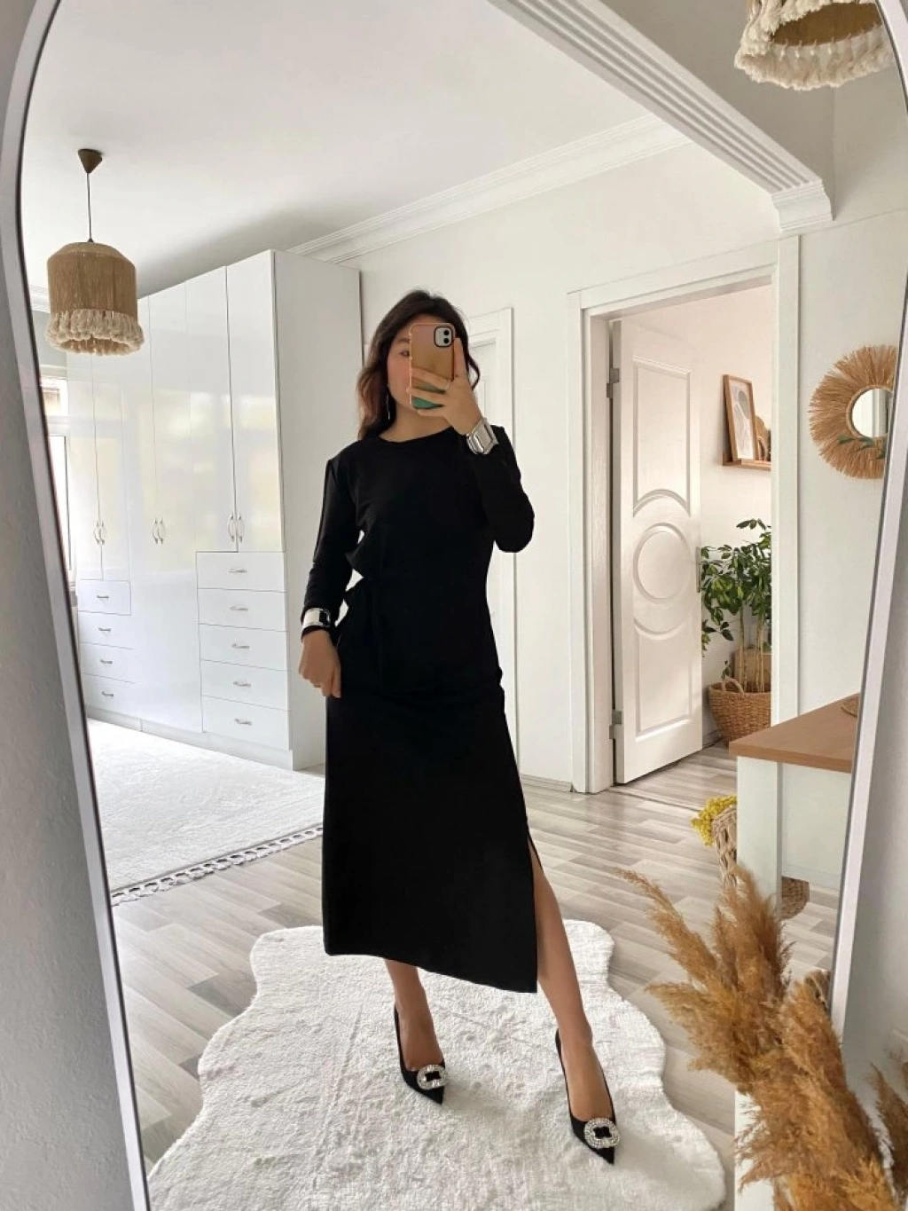 Kadın Uzun Kollu Bisiklet Yaka Belden çapraz Bağlamalı Yandan Yırtmaçlı Uzun Viskon Iki Iplik Elbise