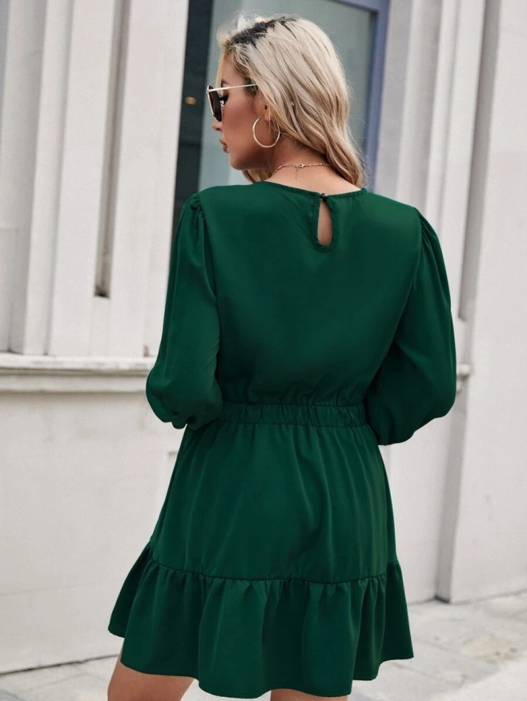Kadın Uzun Kollu Bisiklet Yaka Beli Lastikli Fırfırlı Ithal Krep Elbise