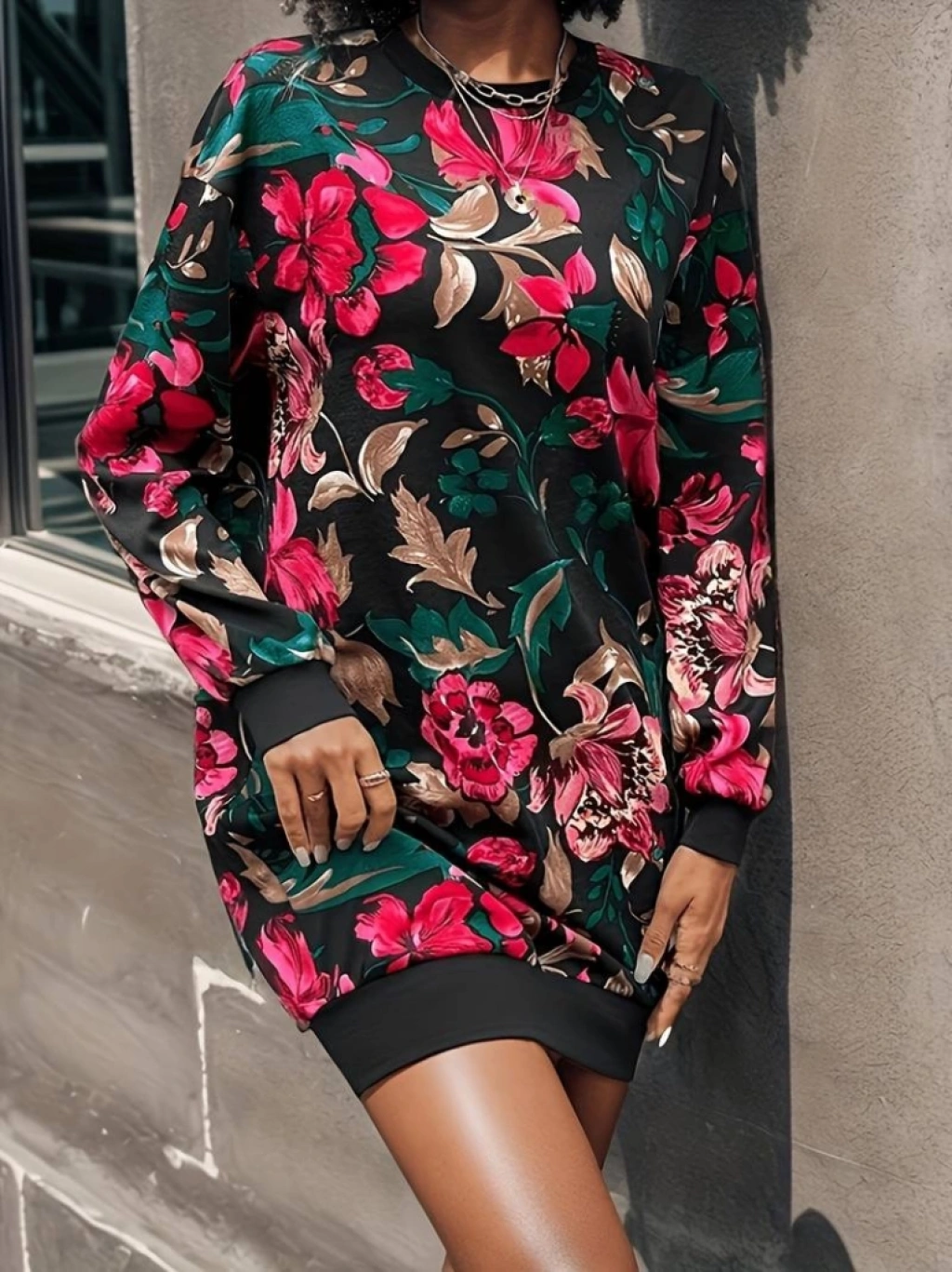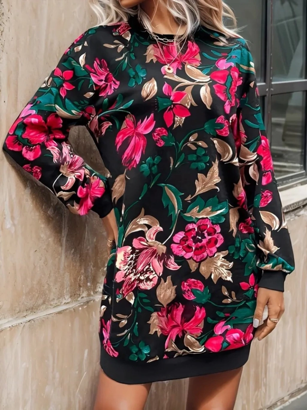 Kadın Uzun Kollu Bisiklet Yaka çiçek Baskılı şardonlu Dalgıç Elbise