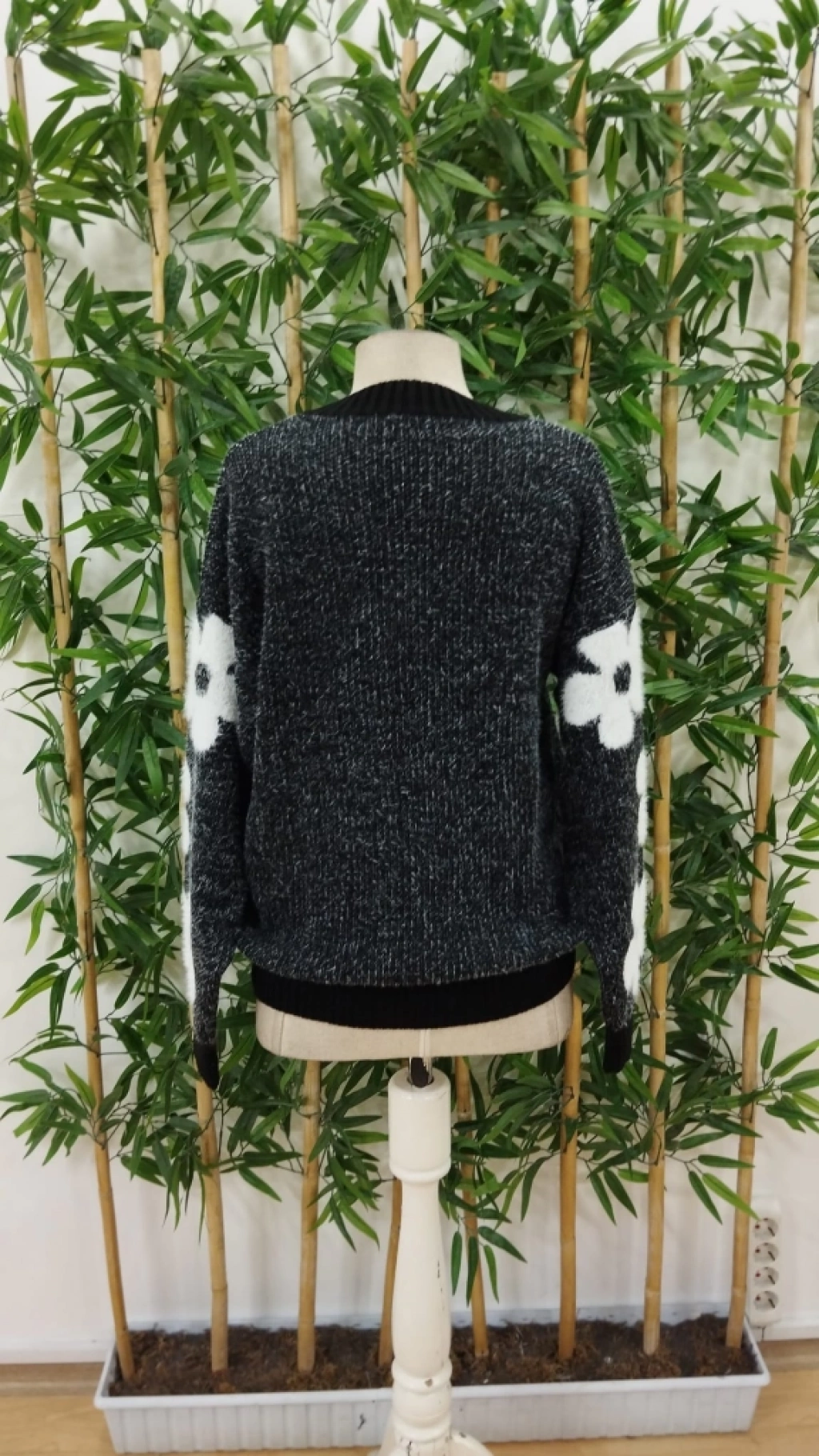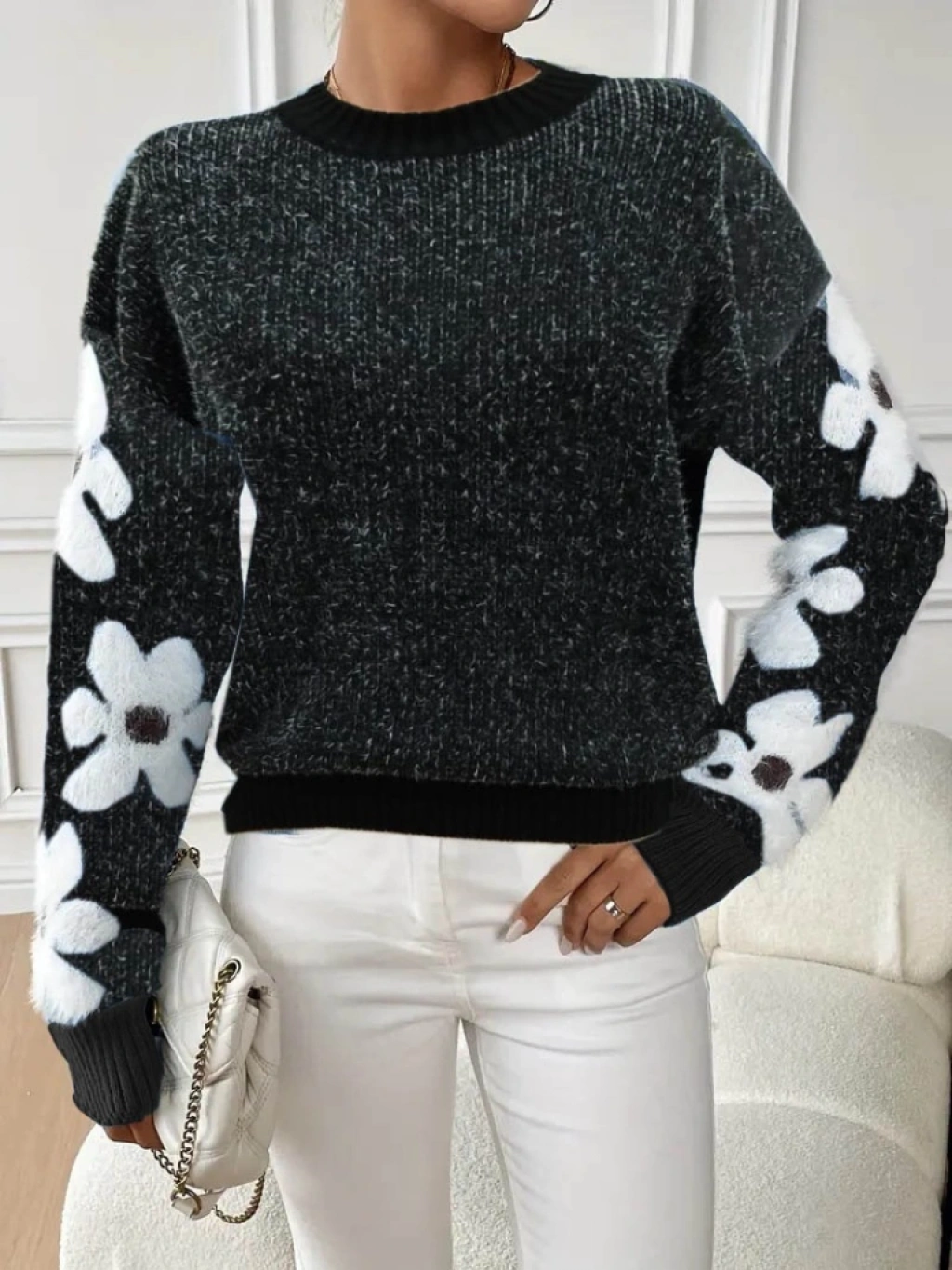 Kadın Uzun Kollu Bisiklet Yaka çiçek Desenli Triko Bluz