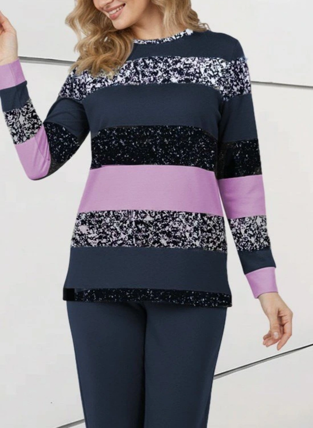 Kadın Uzun Kollu Bisiklet Yaka çizgili Desen Iki Iplik Bluz Ve Pantolon Ikili Takım