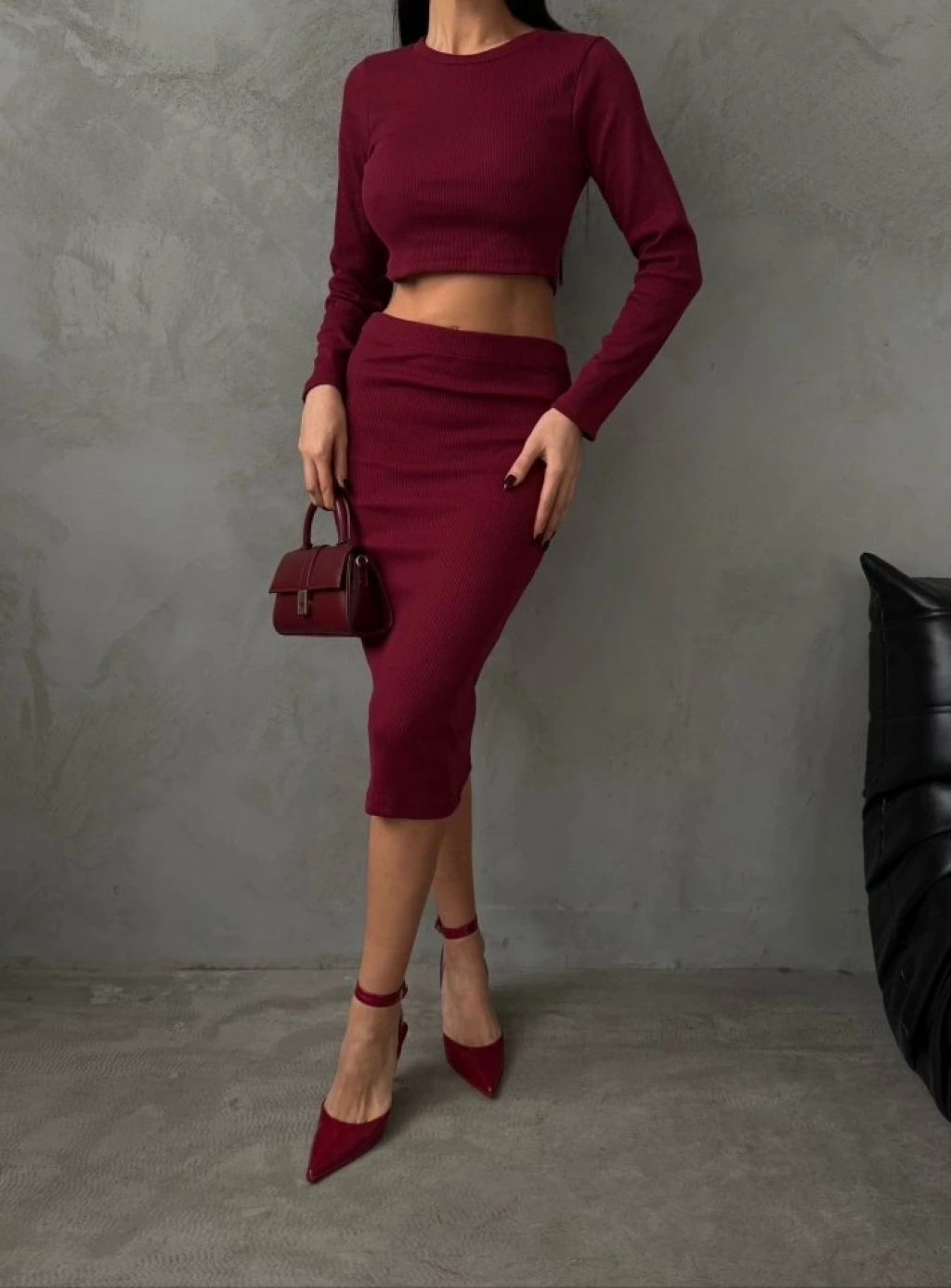 Kadın Uzun Kollu Bisiklet Yaka Crop Ve Midi Boy Kaşkorse Kumaş Etek Ikili Takım