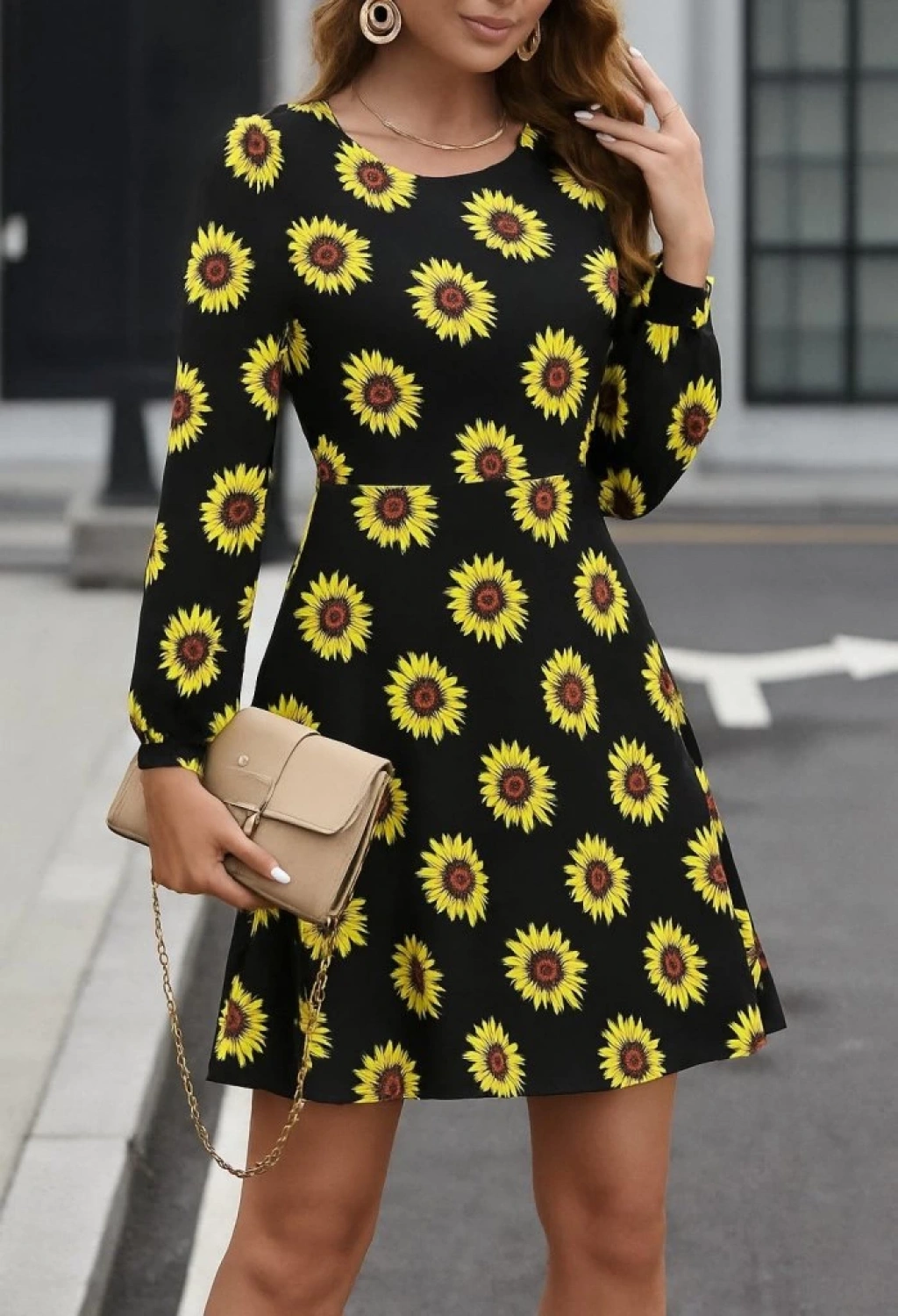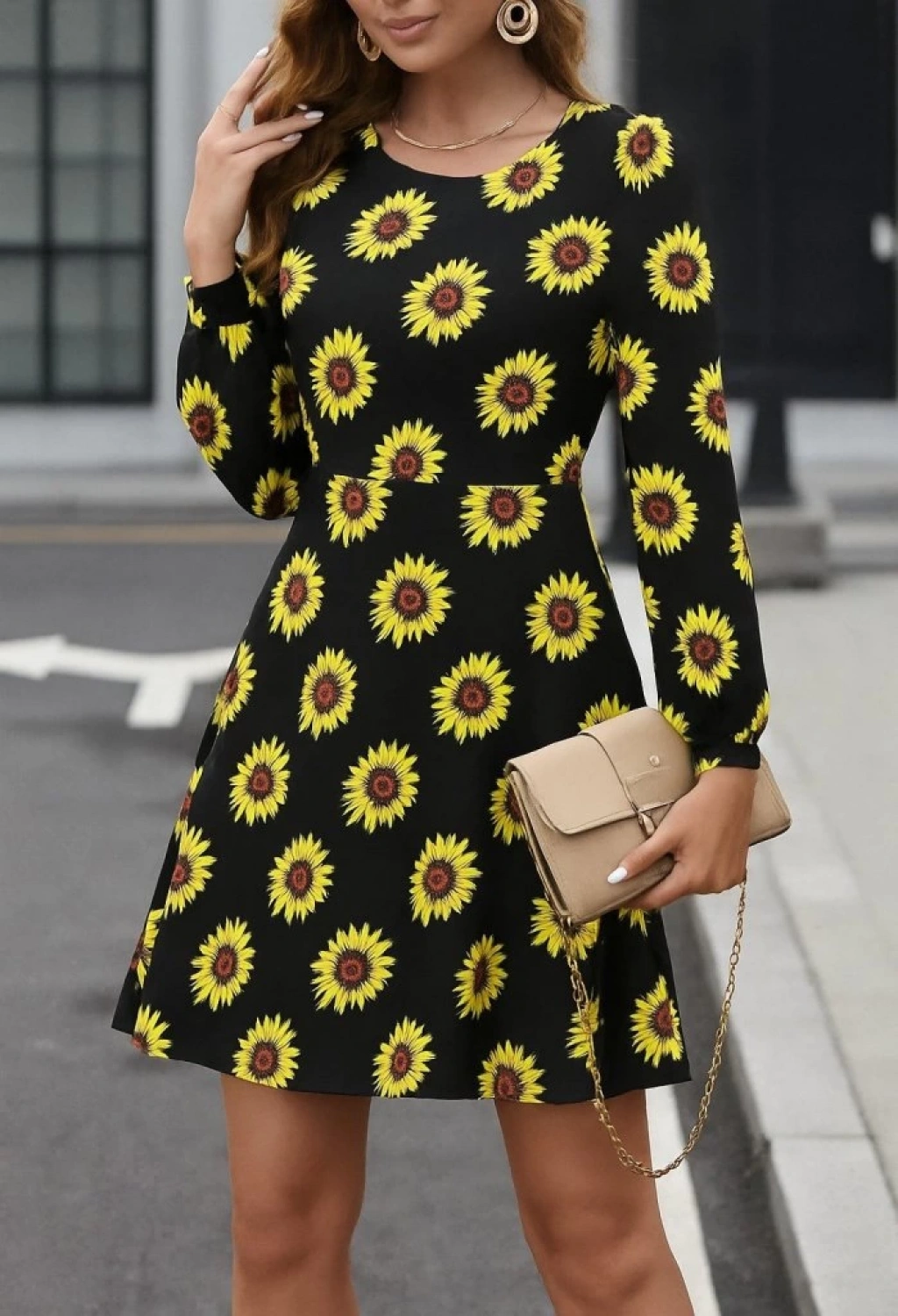 Kadın Uzun Kollu Bisiklet Yaka Desenli Kısa Krep Elbise