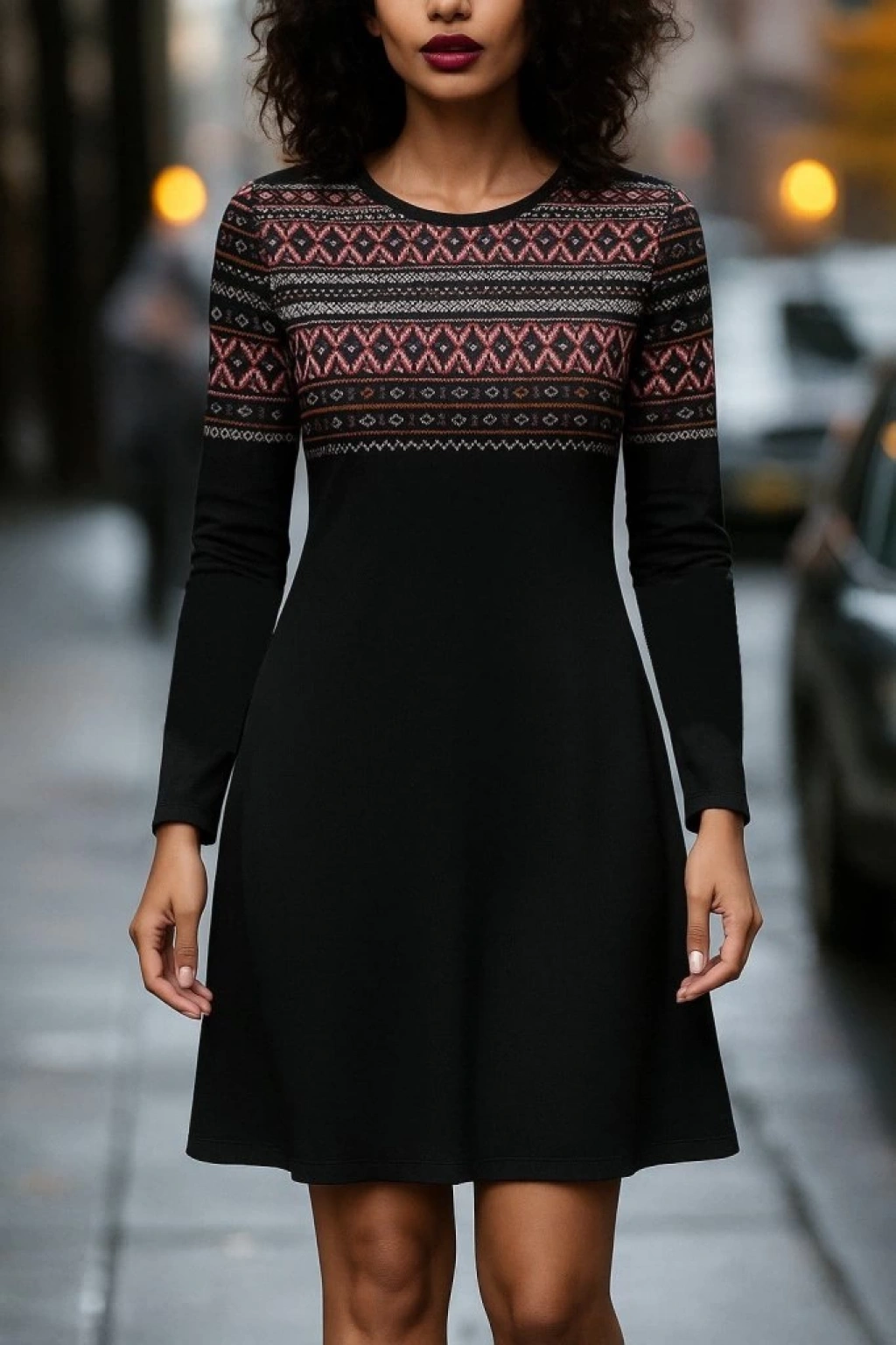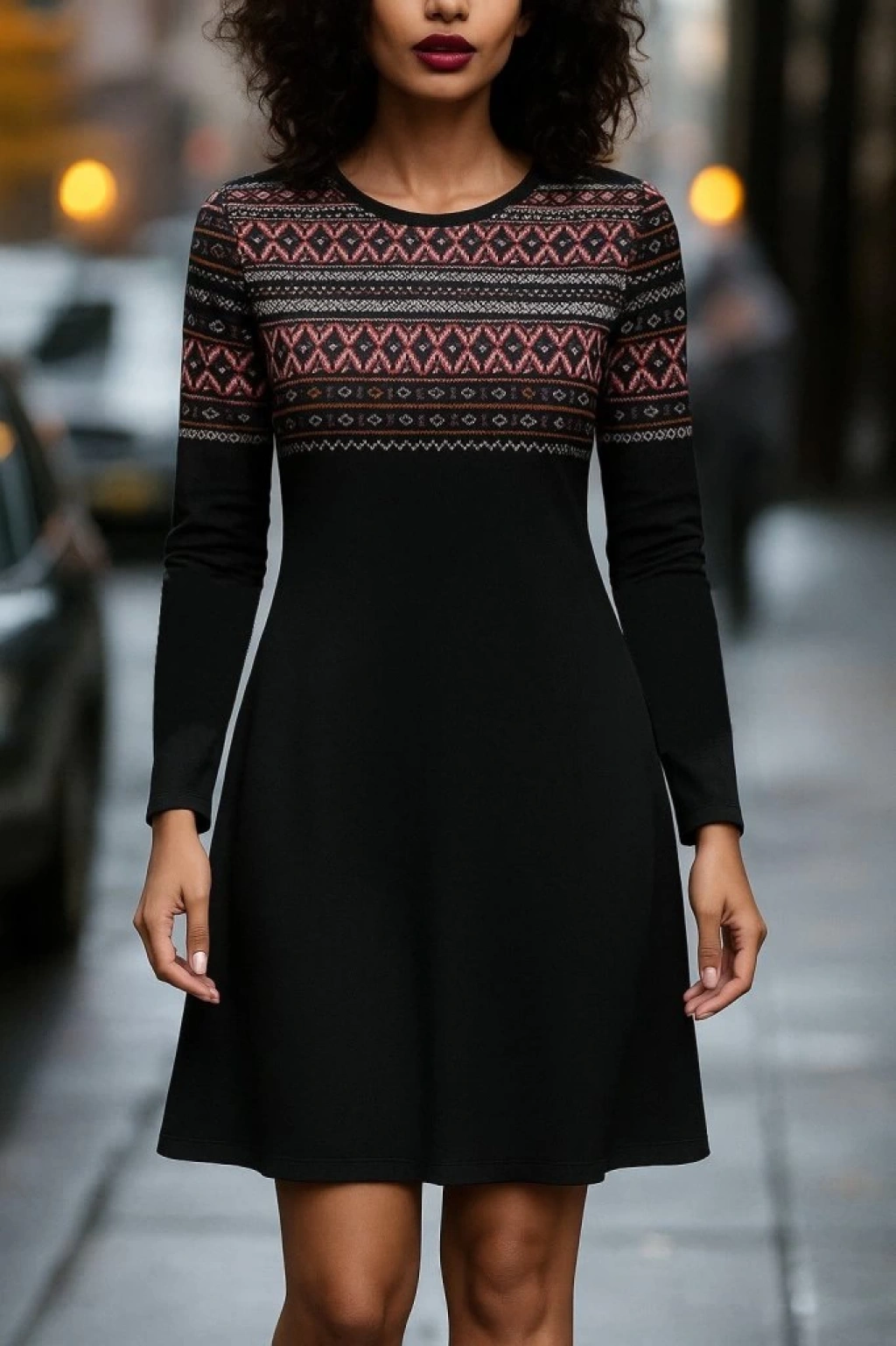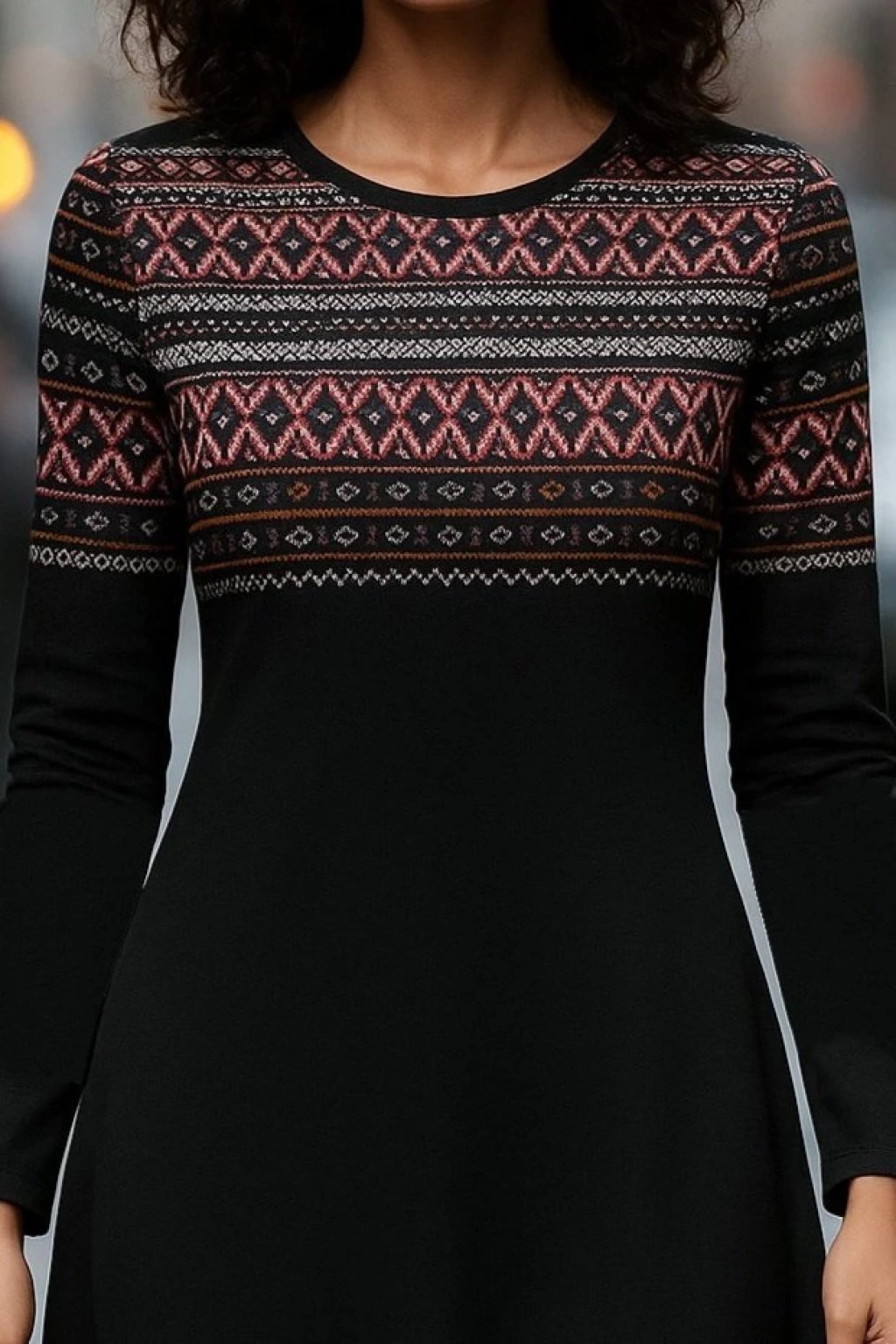 Kadın Uzun Kollu Bisiklet Yaka Etnik Desenli Kısa şardonlu Dalgıç Elbise