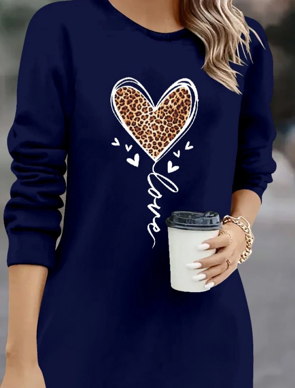 Kadın Uzun Kollu Bisiklet Yaka Kalp Desenli Kısa Viskon Elbise