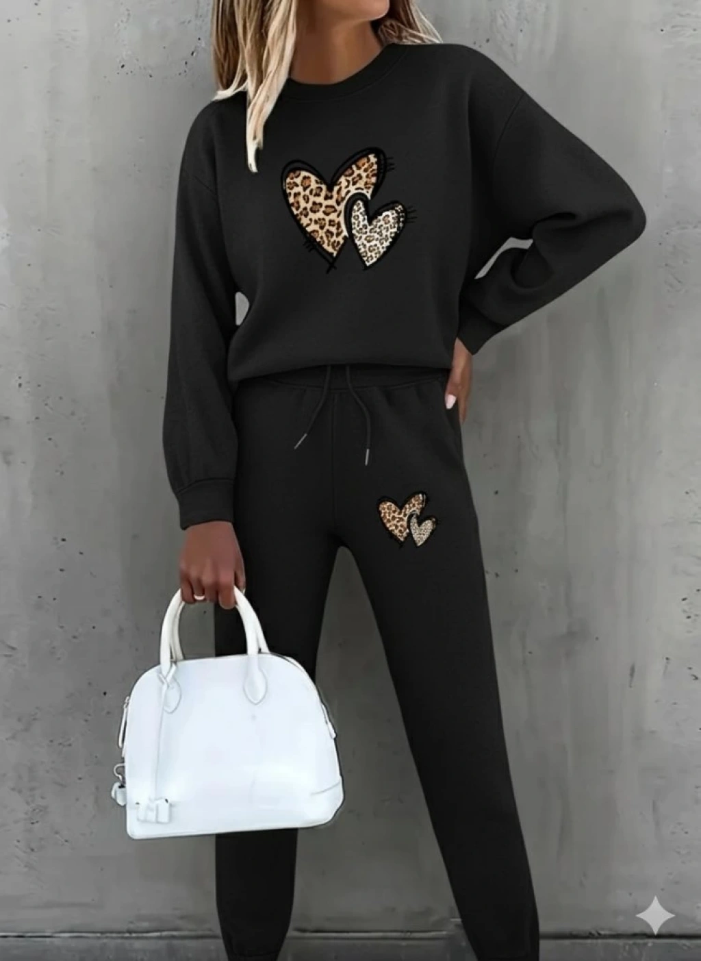 Kadın Uzun Kollu Bisiklet Yaka Kalp Desenli şardonlu üç Iplik Bluz Ve Pantolon Ikili Takım