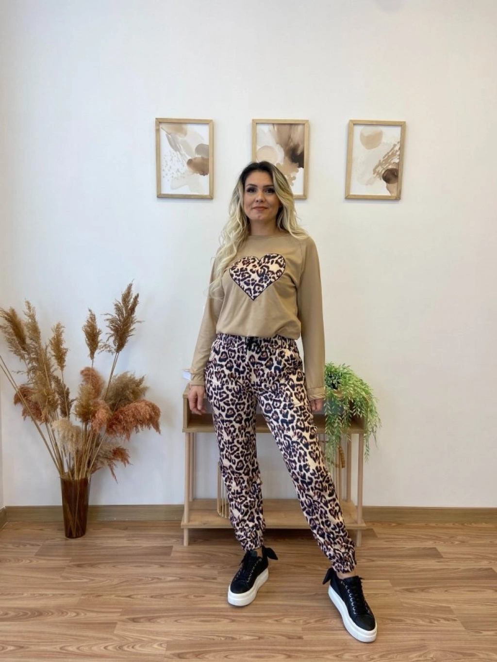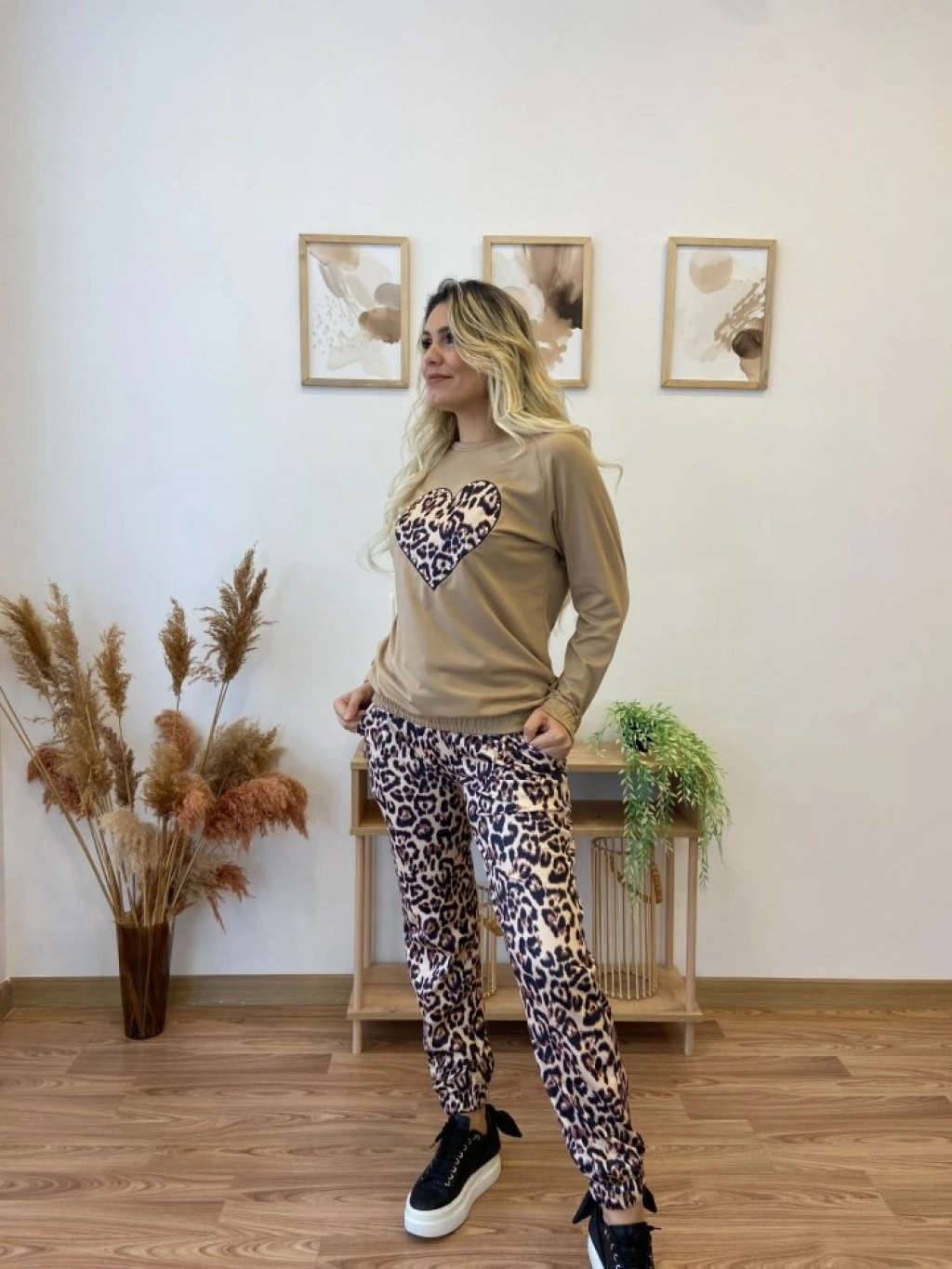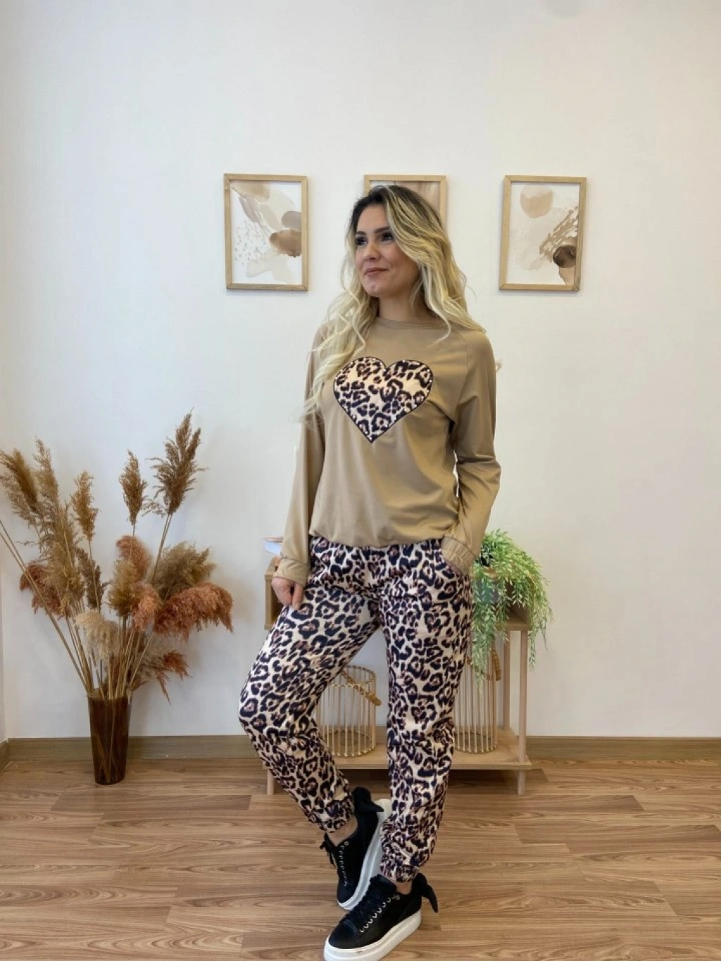 Kadın Uzun Kollu Bisiklet Yaka Kalp Leopar Baskılı Alt Ve üst Dalgıç Ikili Takım