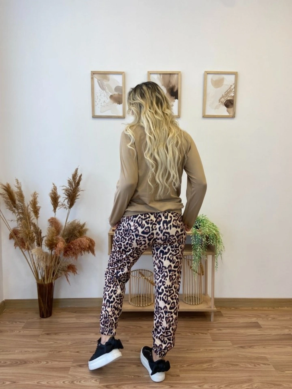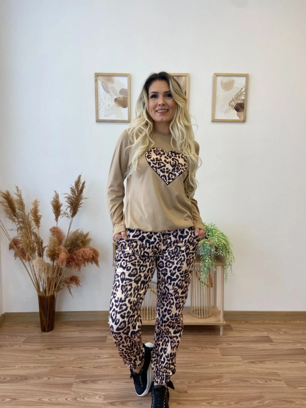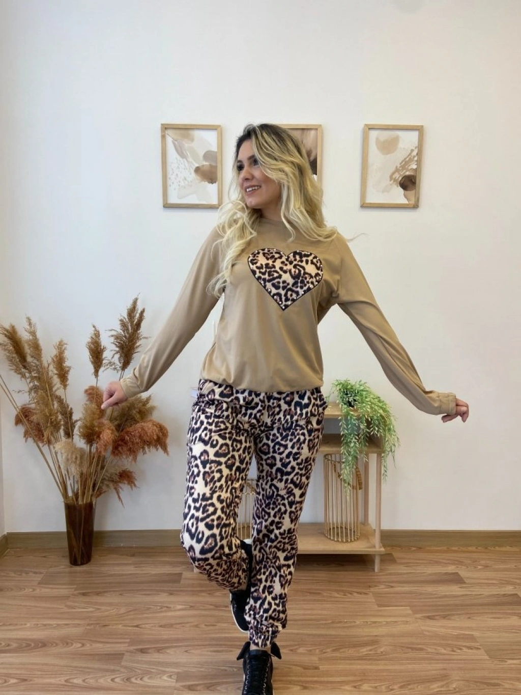 Kadın Uzun Kollu Bisiklet Yaka Kalp Leopar Baskılı Alt Ve üst Dalgıç Ikili Takım