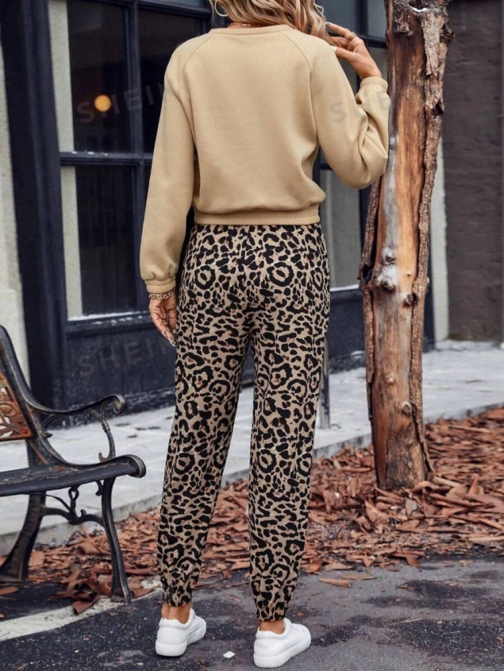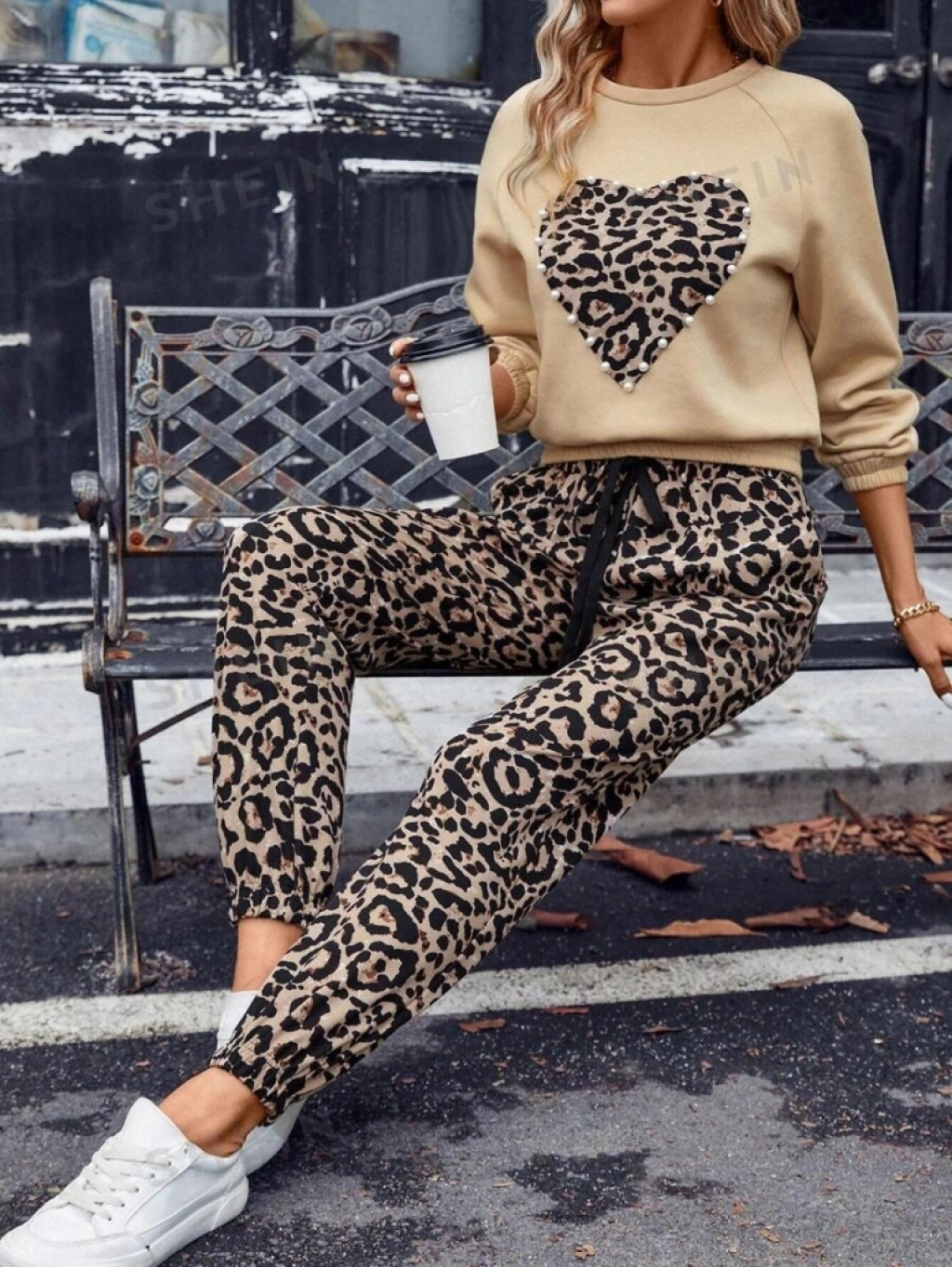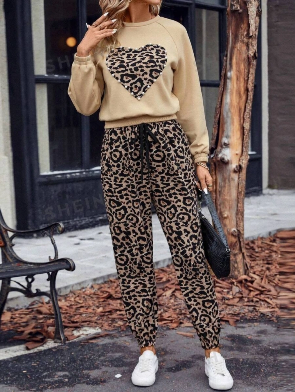 Kadın Uzun Kollu Bisiklet Yaka Kalp Leopar Baskılı Alt Ve üst Dalgıç Ikili Takım