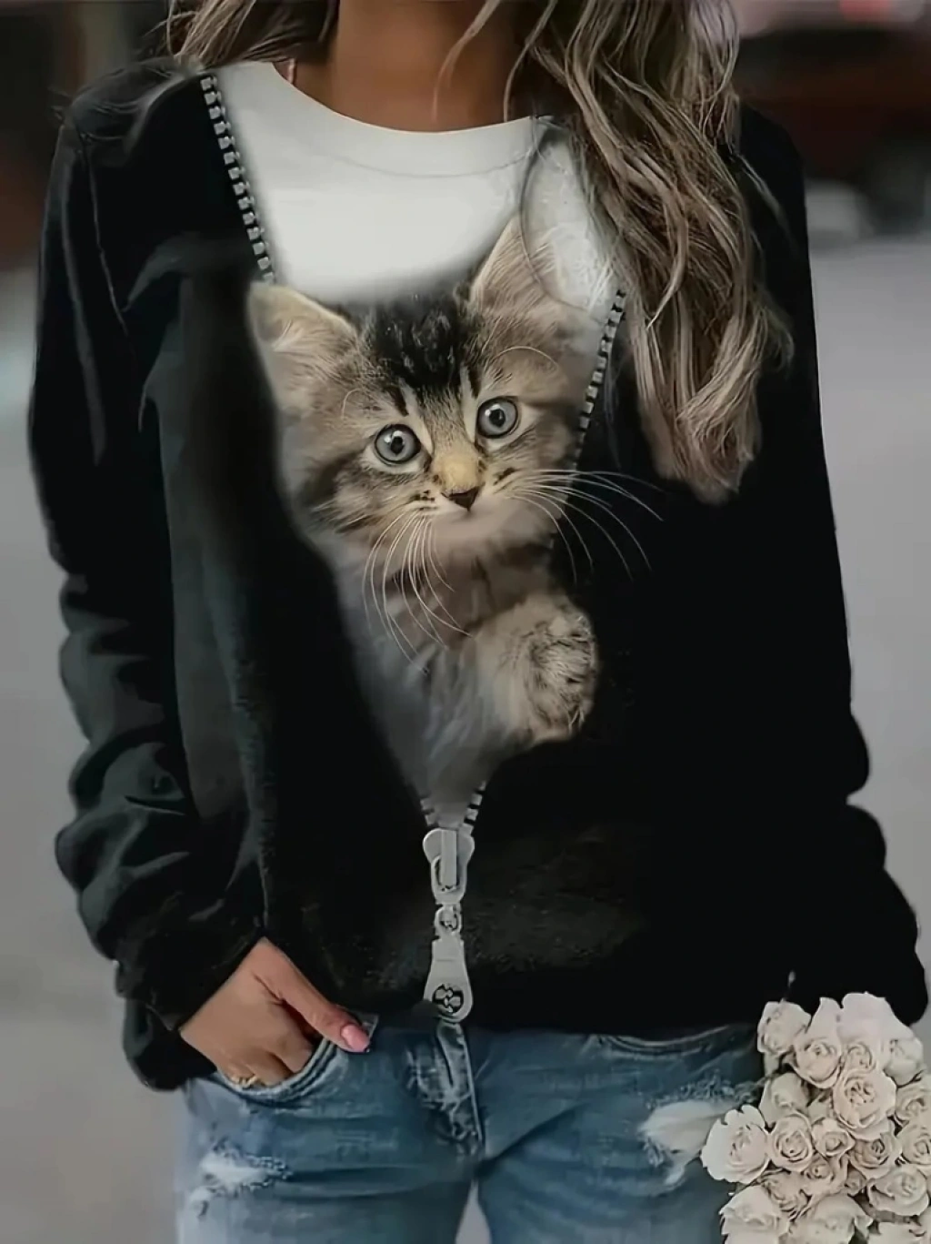 Kadın Uzun Kollu Bisiklet Yaka Kedi Baskılı şardonlu Dalgıç Bluz