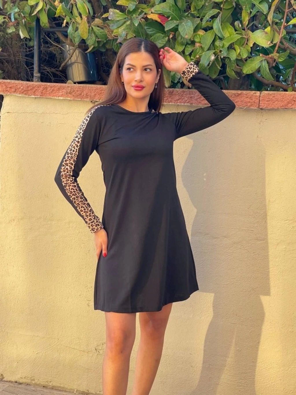 Kadın Uzun Kollu Bisiklet Yaka Kollar Leopar Detay Iki Iplik Mini Boy Elbise