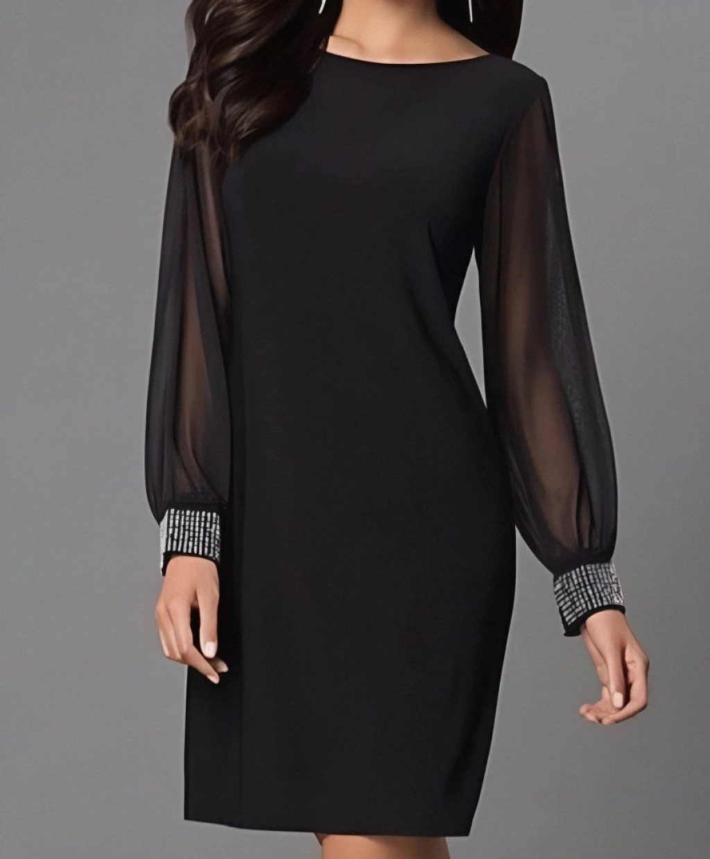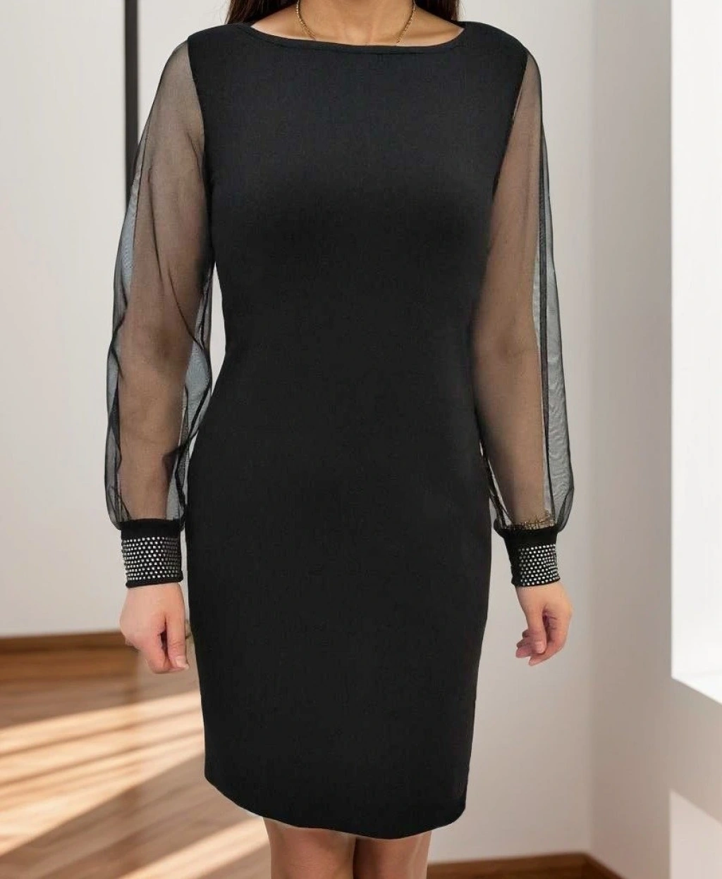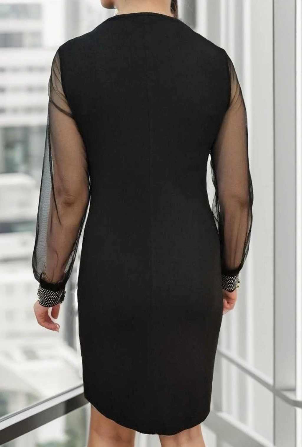 Kadın Uzun Kollu Bisiklet Yaka Kollar Tül Manşet Taş Işlemeli Krep Elbise