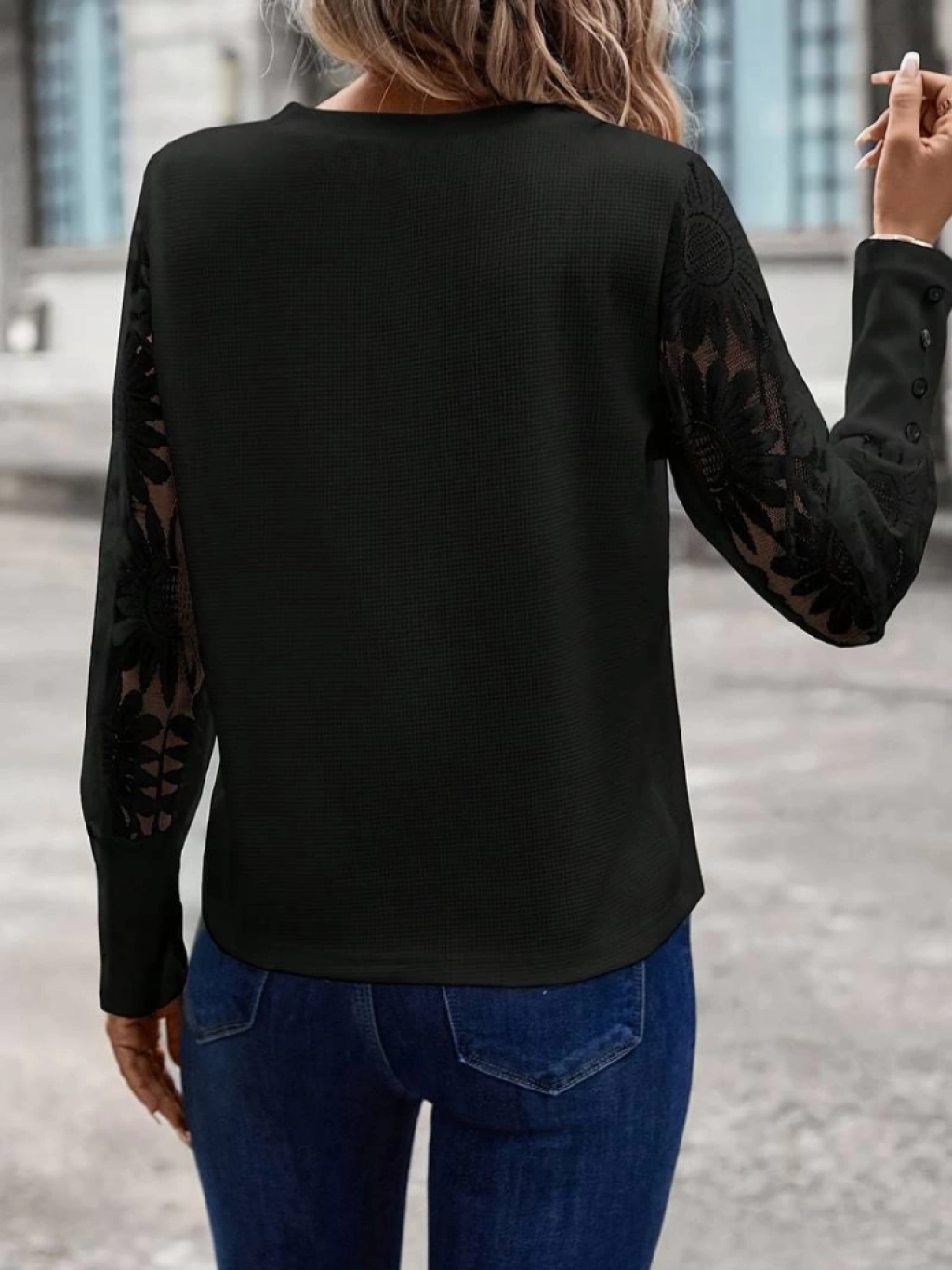 Kadın Uzun Kollu Bisiklet Yaka Kolları çiçekli Waffle Bluz