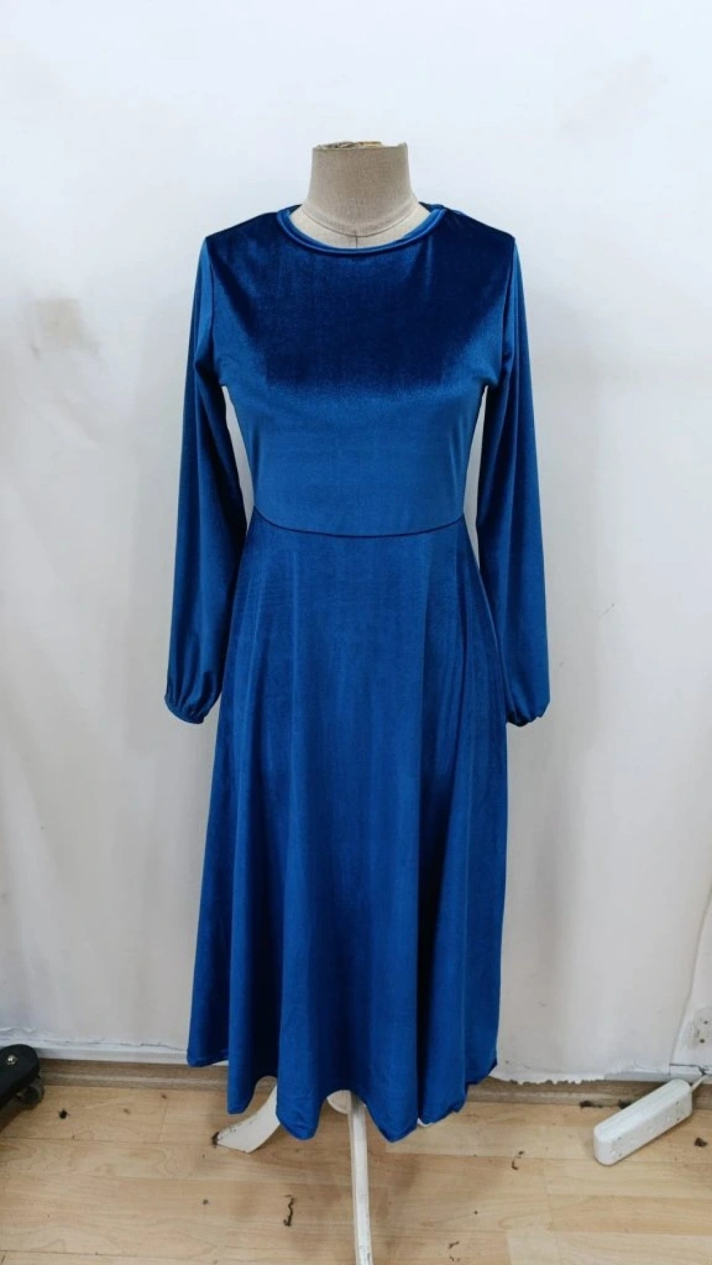 Kadın Uzun Kollu Bisiklet Yaka Midi Kadife Mavi Elbise
