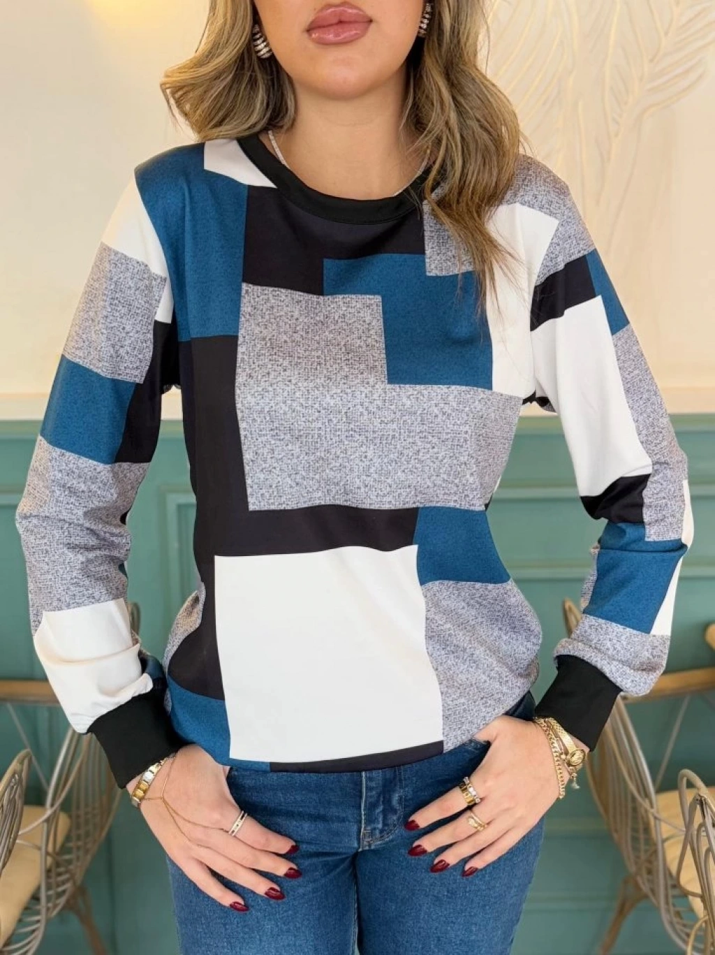 Kadın Uzun Kollu Bisiklet Yaka Renkli Blok Baskı Dalgıç Bluz