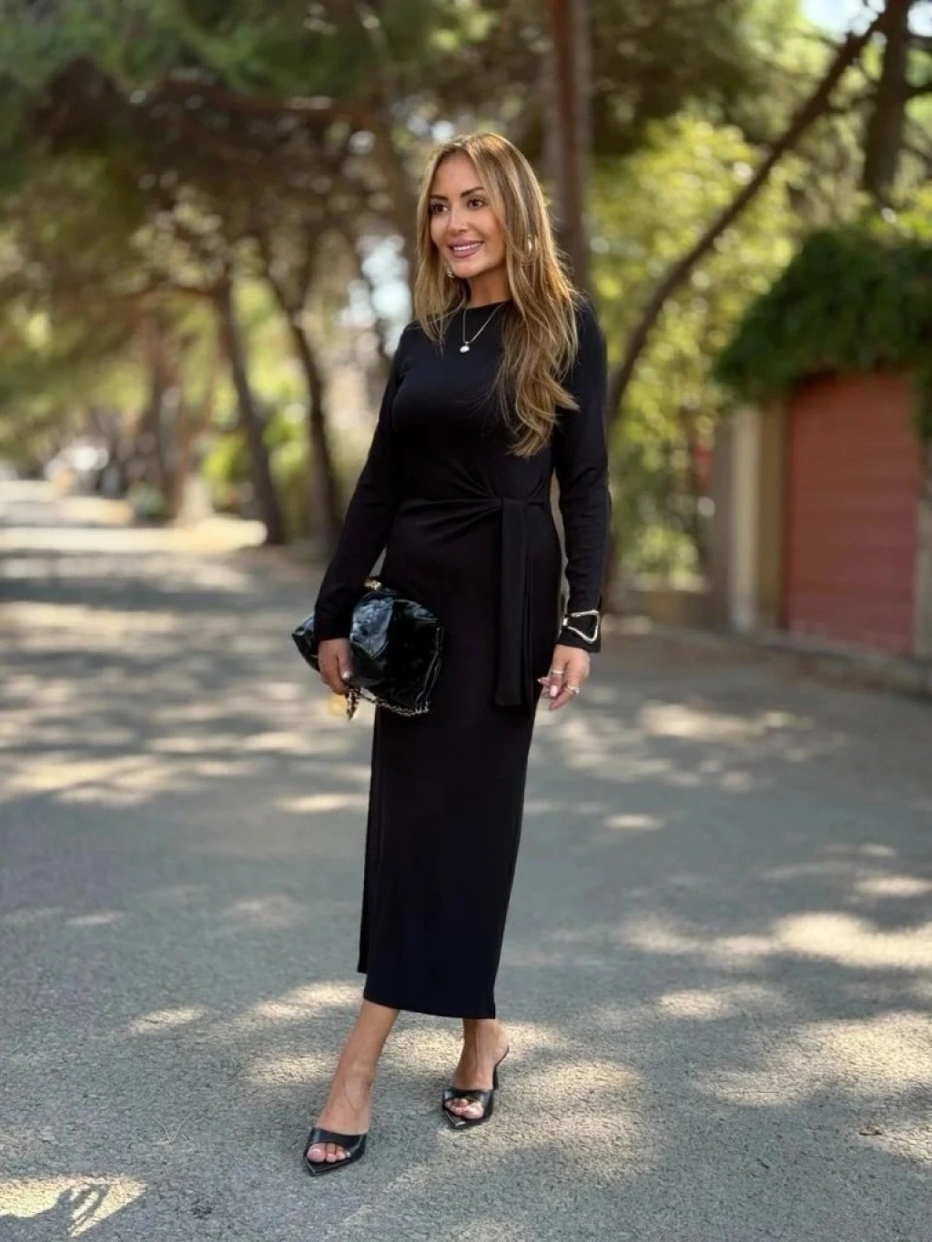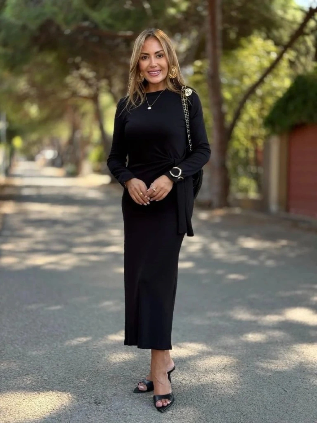 Kadın Uzun Kollu Bisiklet Yaka Yandan Bağlamalı Uzun Modal Elbise
