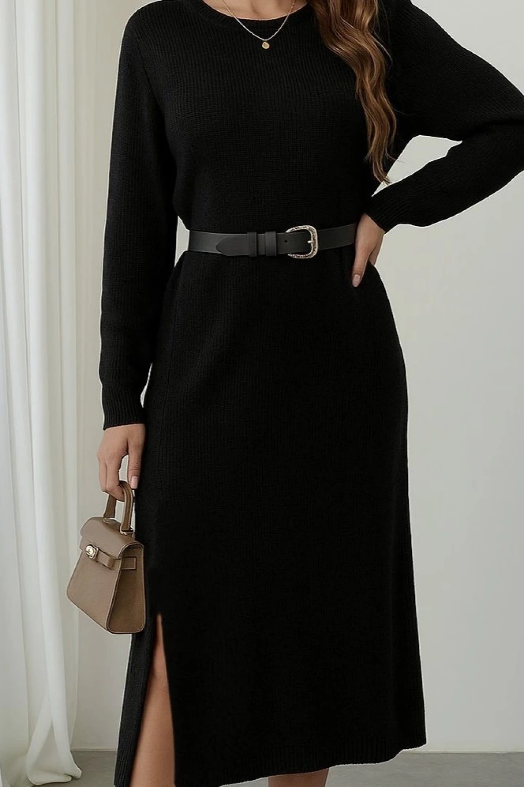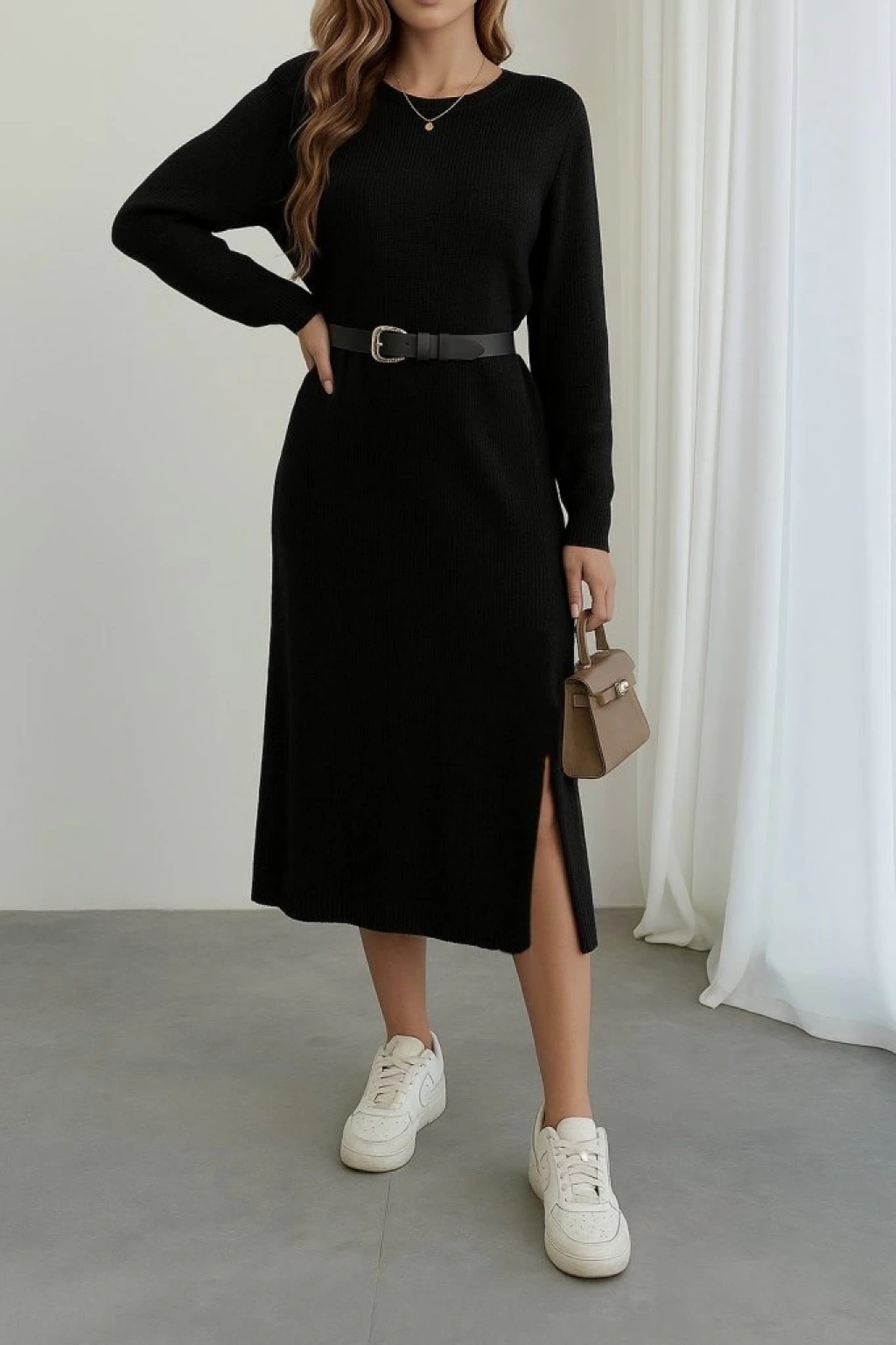 Kadın Uzun Kollu Bisiklet Yaka Yandan Yırtmaçlı Midi Triko Elbise