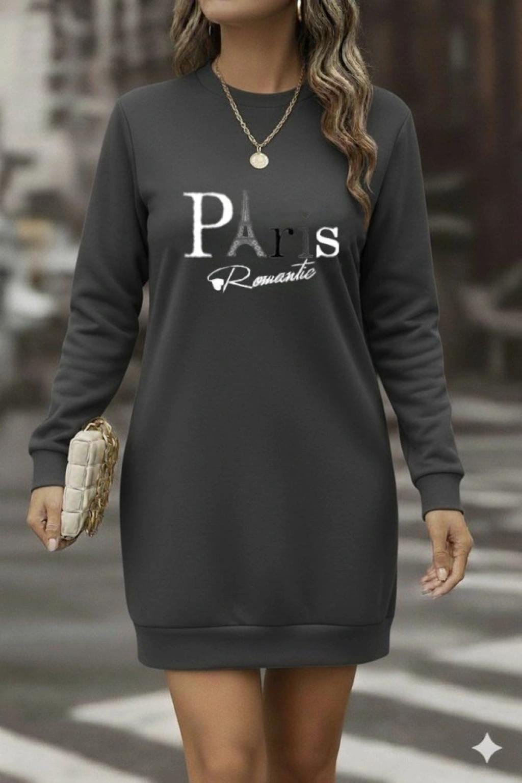 Kadın Uzun Kollu Bisiklet Yaka Yazılı Kısa Viskon Iki Iplik Elbise