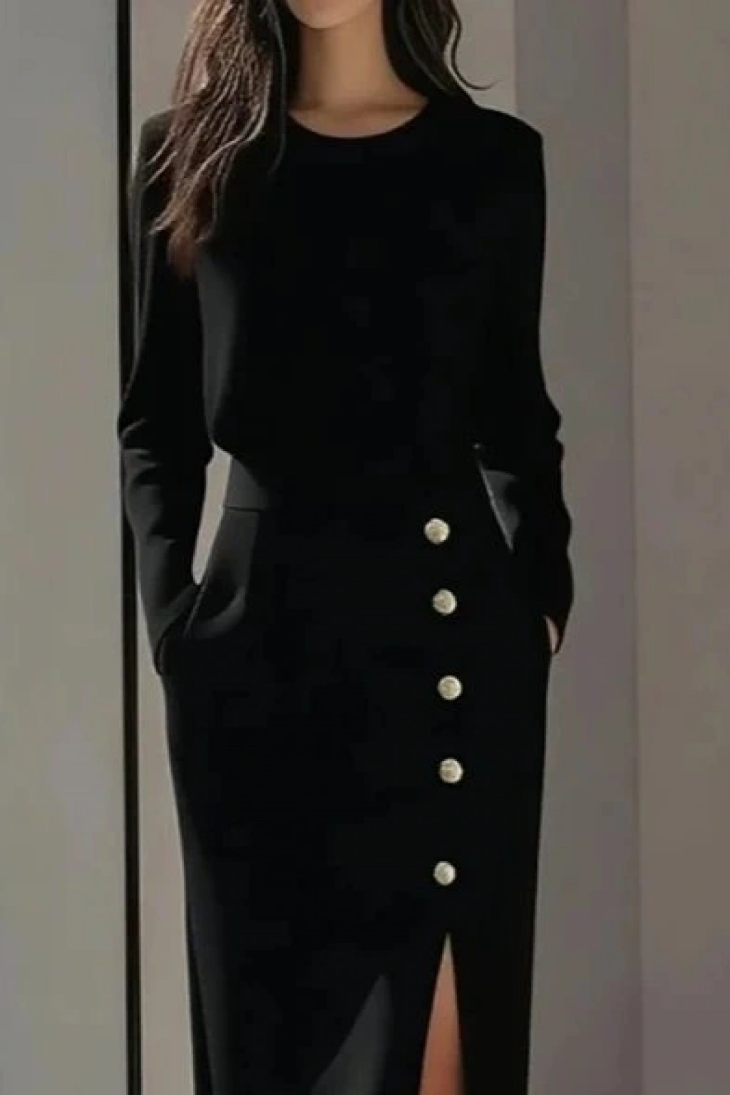 Kadın Uzun Kollu Bisiklet Yakalı Yandan Yırtmaçlı Düğmeli Midi Ithal Krep Elbise