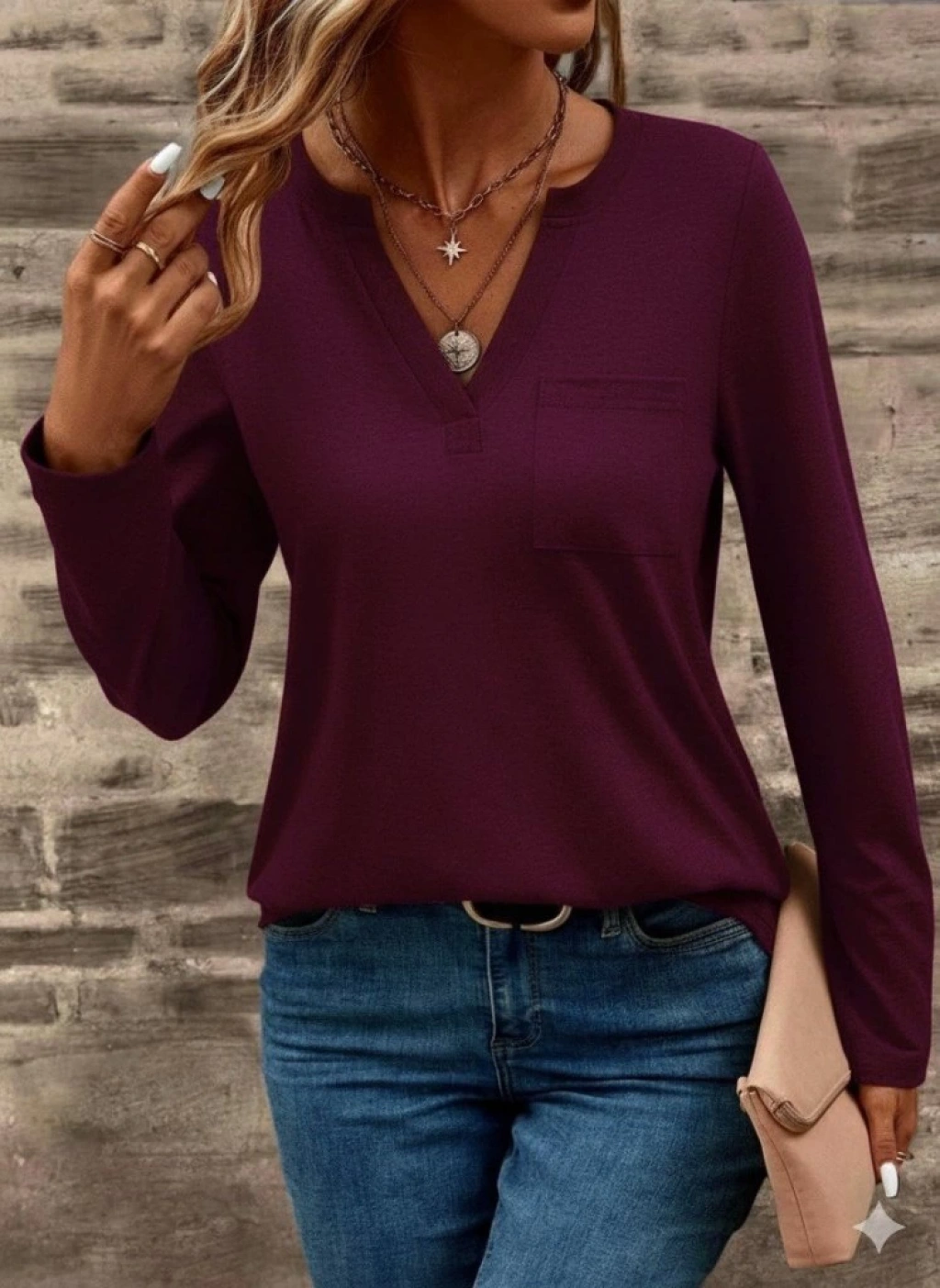 Kadın Uzun Kollu Cepli V Yakalı Viskon Iki Iplik Mürdüm Bluz