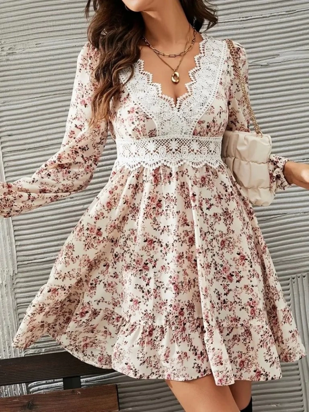 Kadın Uzun Kollu Dantel V Yakalı Mini Desenli Süprem Elbise