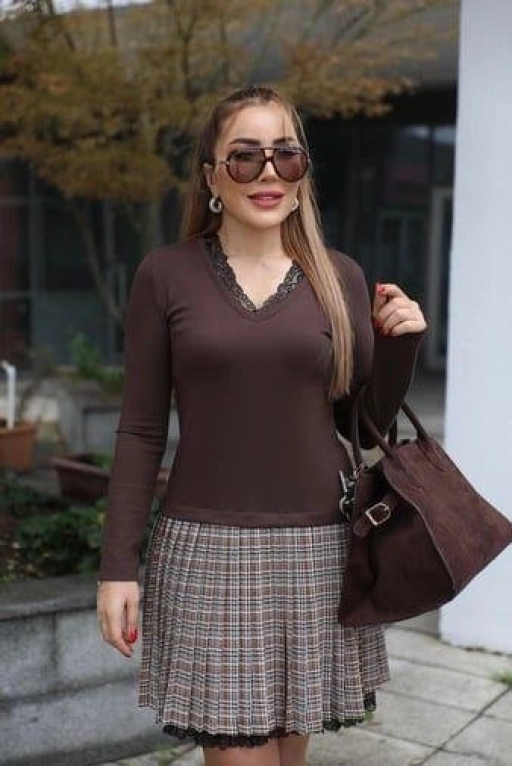 Kadın Uzun Kollu Denteli Yaka Ekose Etek Detay Diz üstü Elbise