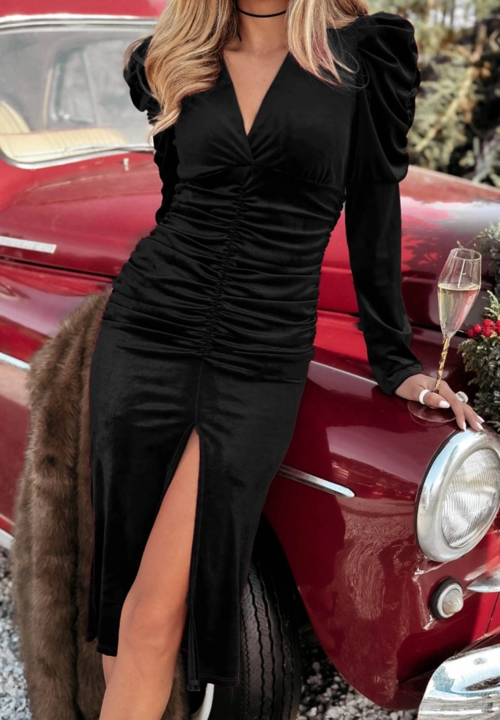 Kadın Uzun Kollu Derin Kruvaze Yakalı önden Büzgülü Yırtmaç Detaylı Kadife Midi Elbise