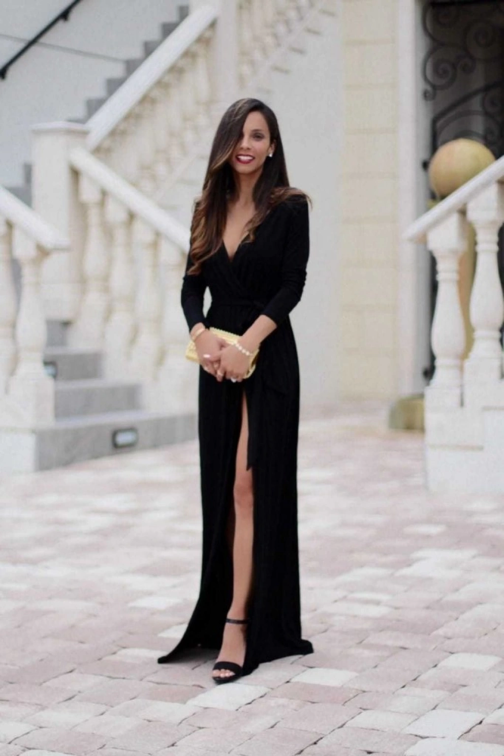 Kadın Uzun Kollu Derin V Kruvaze Yaka Beli Lastik Yırtmaç Ve Bağcık Detaylı Sandy Tam Boy Elbise