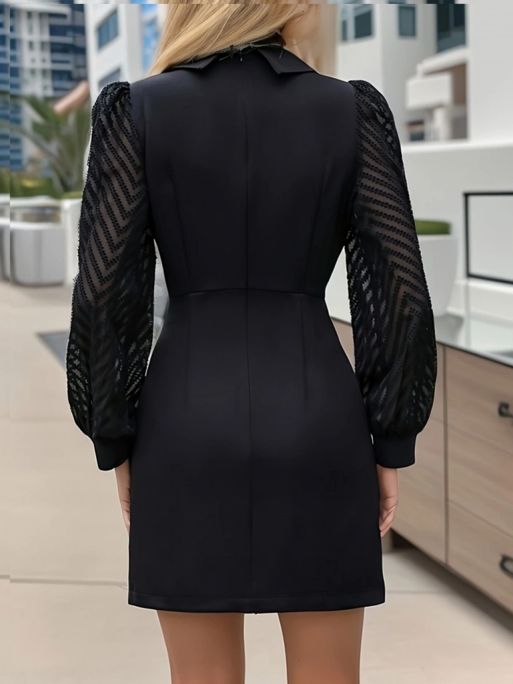 Kadın Uzun Kollu Eteği Düğme Kolu Tül Detay Ithal Krep Ceket Yaka Mini Elbise