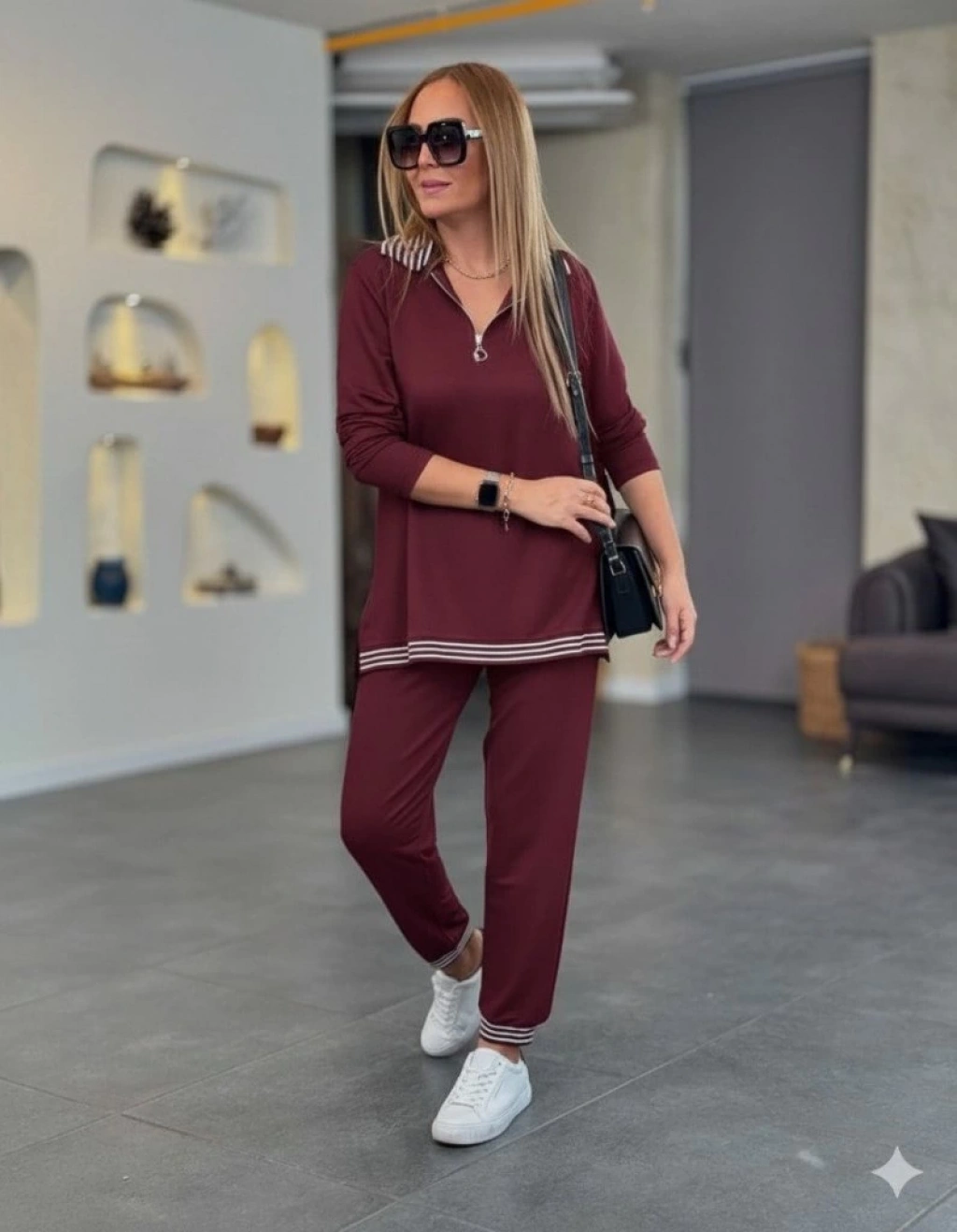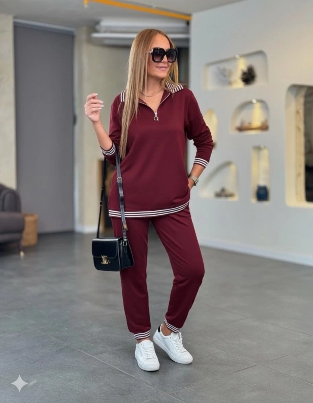 Kadın Uzun Kollu Fermuarlı şerit Detay Desenli Alt üst Ikili Viskon Iki Iplik Takım